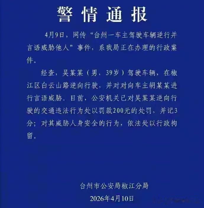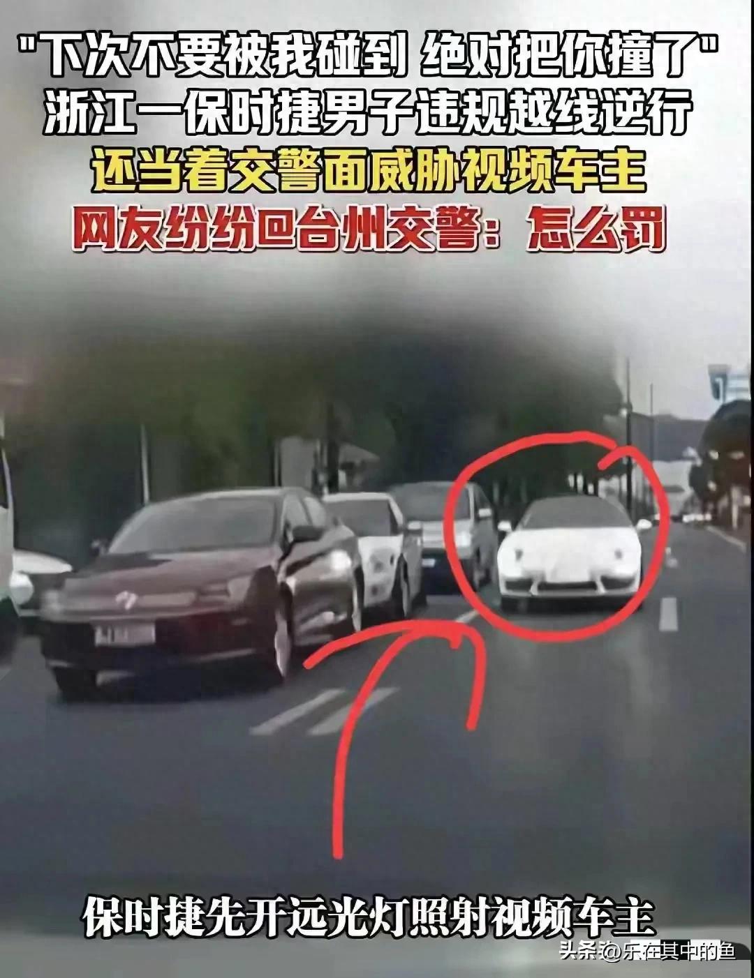 涉事保时捷车主吴某某,男,39岁,因在椒江区白云山路逆向行驶,并对向车主胡某某进行言语威胁,被依法处以罚款200元、驾驶证记3分,同时因其威胁他人人身安全的行为,被依法行政拘留。