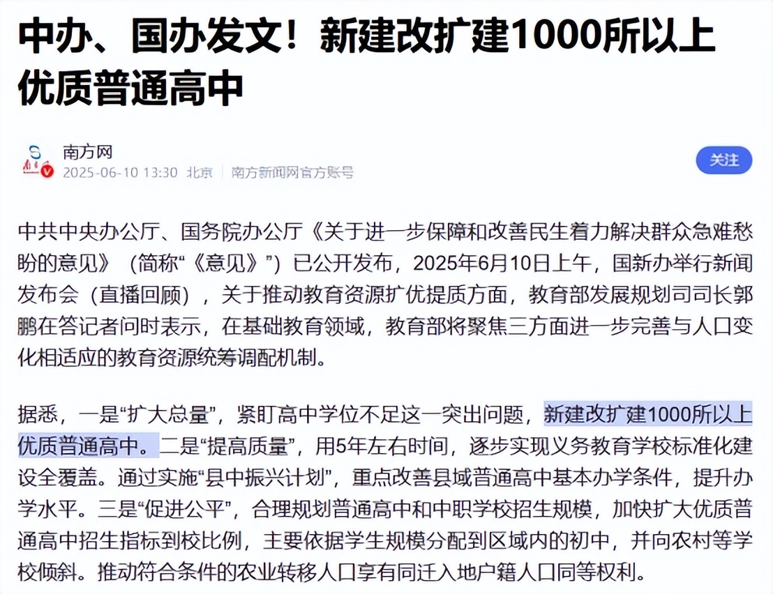 这些新增的教学楼和招生名额,大部分都直接放到了县城和乡镇,先把高中的大门给开得更宽了,这就意味着能上普通高中的孩子总量变多了。