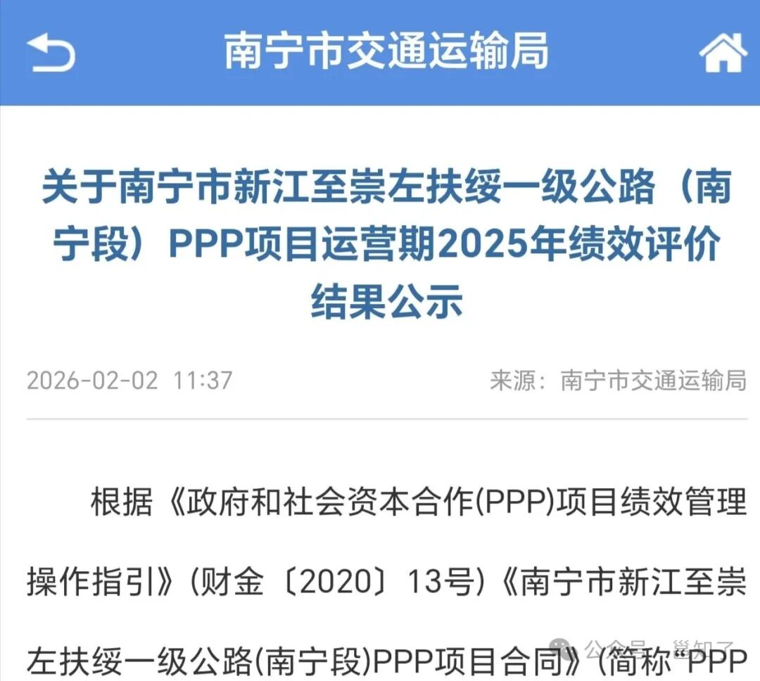 且了解到,2月2日,新江至崇左扶绥一级公路(南宁段)PPP项目运营期2025年绩效评价结果公示。