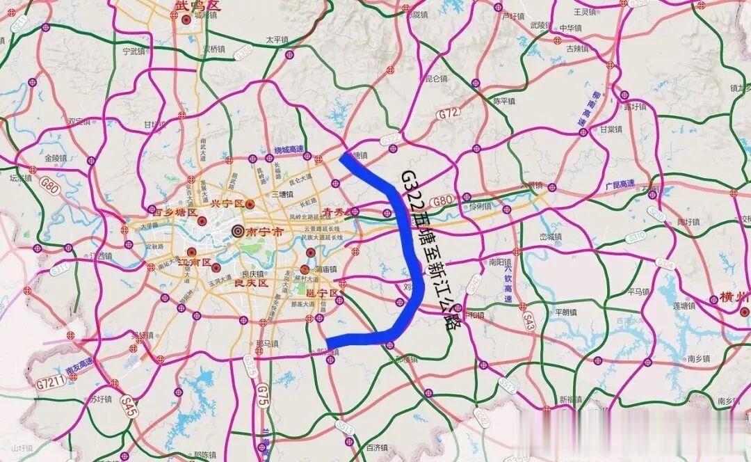 ❶其中,南宁段约47.66公里,去年全线通车,途经南宁五象新区、邕宁区、良庆区、经开区、空港经济区。