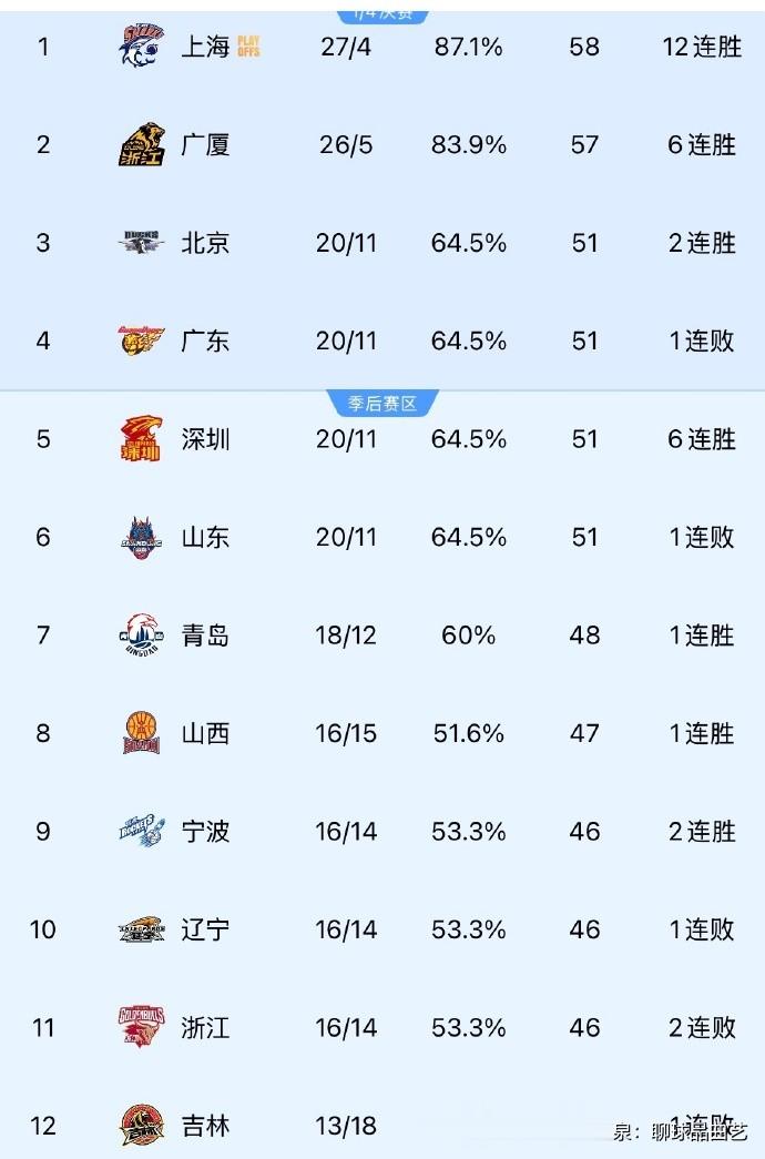 前四争夺已经进入白热化。上海、广厦高居前两名,3-6名的北京、广东、深圳、山东战绩完全持平,稍有不慎就可能跌出前六。