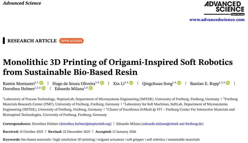 引文格式:Montazeri A, Sandmann S, Helmer D, et al. Monolithic 3D Printing of Origami-Inspired Soft Robotics from Sustainable Bio-Based Resin[J]. Advanced Science, 2026, e2507395.