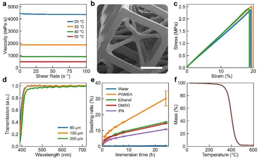 图1用于光诱导3D打印的生物基树脂的物理化学、机械、微观和热表征。a)不同温度下的剪切速率依赖性粘度,从20°C时的4377 mPa·s降至50°C时的492 mPa·s,远低于DLP树脂的10 Pa·s阈值,并可实现环境温度3D打印。b)通过DLP制造的立方晶格测试结构的扫描电子显微镜(SEM)成像,展示了尺寸小至大约90 µm(比例尺:500 µm)的微尺度特征的成功3D打印。c)垂直打印的ISO 527-2 5B型样品的应力-应变响应,显示线弹性,无塑性变形;杨氏模量、极限拉伸强度和断裂应变分别为18.9±0.5、2.4±0.1和19.6±0.3%。d)固化薄膜(60–200 µm)的紫外可见光透射率在550 nm处表现出>97%的透明度,并具有轻微的厚度依赖性衰减。e)在水中和某些溶剂中24小时后的溶胀行为,表明在水中的吸收可以忽略不计,在极性醇和DMSO (10–15 wt.%)中适度溶胀,在PGMEA (约30 wt.%)中明显溶胀和开裂,在丙酮中崩解。f) 3D打印样品的热重分析(TGA)显示出典型的交联网络的均匀、单阶段降解曲线,起始降解温度(T5)为321°C,最大分解速率为393°C,500°C时的炭产率为<2 wt.%。