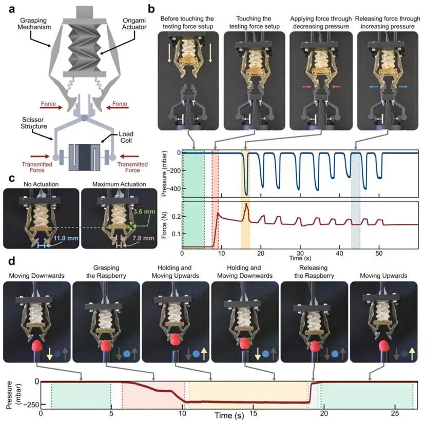 图4夹具性能和精细的物体操纵。(a)折纸夹具与剪刀结构和测力传感器集成的示意图。(b)力测试期间夹具操作的顺序,显示接近、接触、施力(压力减小)和释放(压力增加)的状态,与随时间测量的压力和力相关。(c)未驱动状态(左)和最大驱动状态(右)的夹具配置比较,表明底座位移和钳口间隙减小。(d)视频S1中的延时图像和相应的压力分布图,展示了夹具精细地抓取、移动和释放覆盆子的能力。