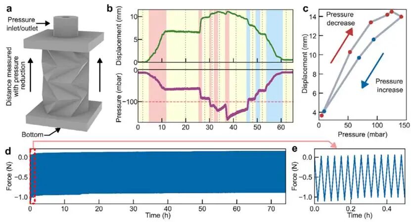 图3a是测试装置示意图。给负压时,Kresling结构轴向收缩。图3b是压力和位移随时间的变化曲线,可以看出几个阶段:阀门打开、压力稳定、阀门关闭。