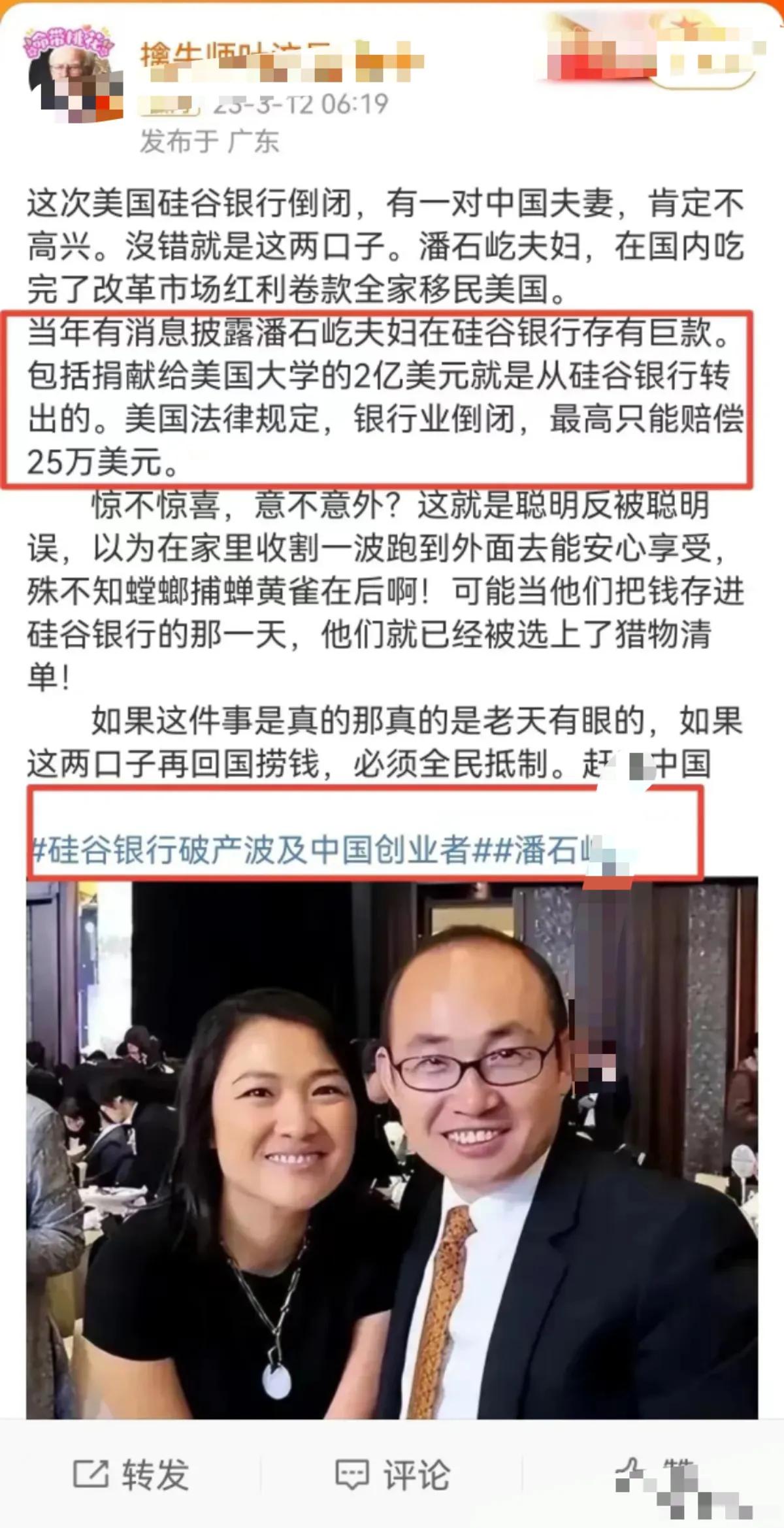 据说,潘石屹两口子在国内赚的几百个亿的钱都存在美国这家硅谷银行!不但是潘石屹两口子,好多中国富豪的钱也都存在这里。这下好了,这家银行突然宣布倒闭了!这些富豪们真正感觉到了美国资本的贪婪。看来,美国真是急眼了,这是要杀大户过年了吗?
