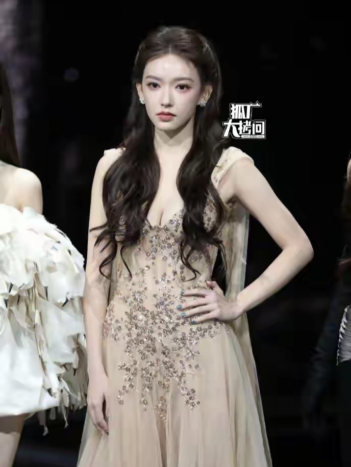 上半身是恰到好处的开叉深v,下半网纱裙若隐若现,网友调侃看得流口水。