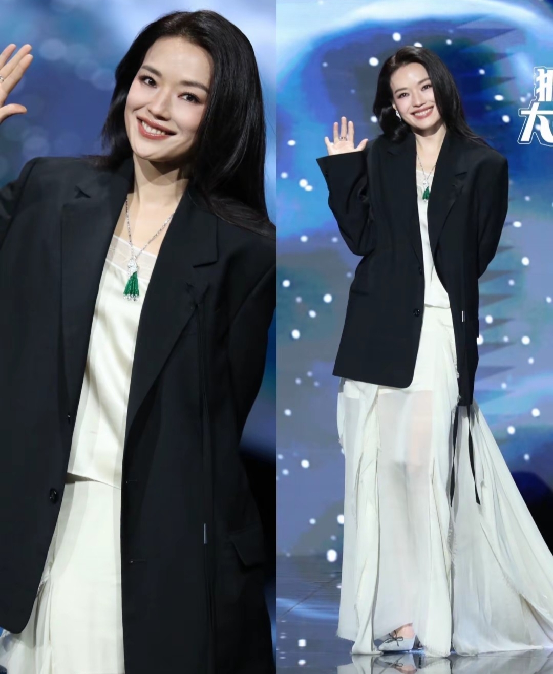 浅色纱裙搭配黑色西装,主打一个保暖又优雅,气质、状态都满分。