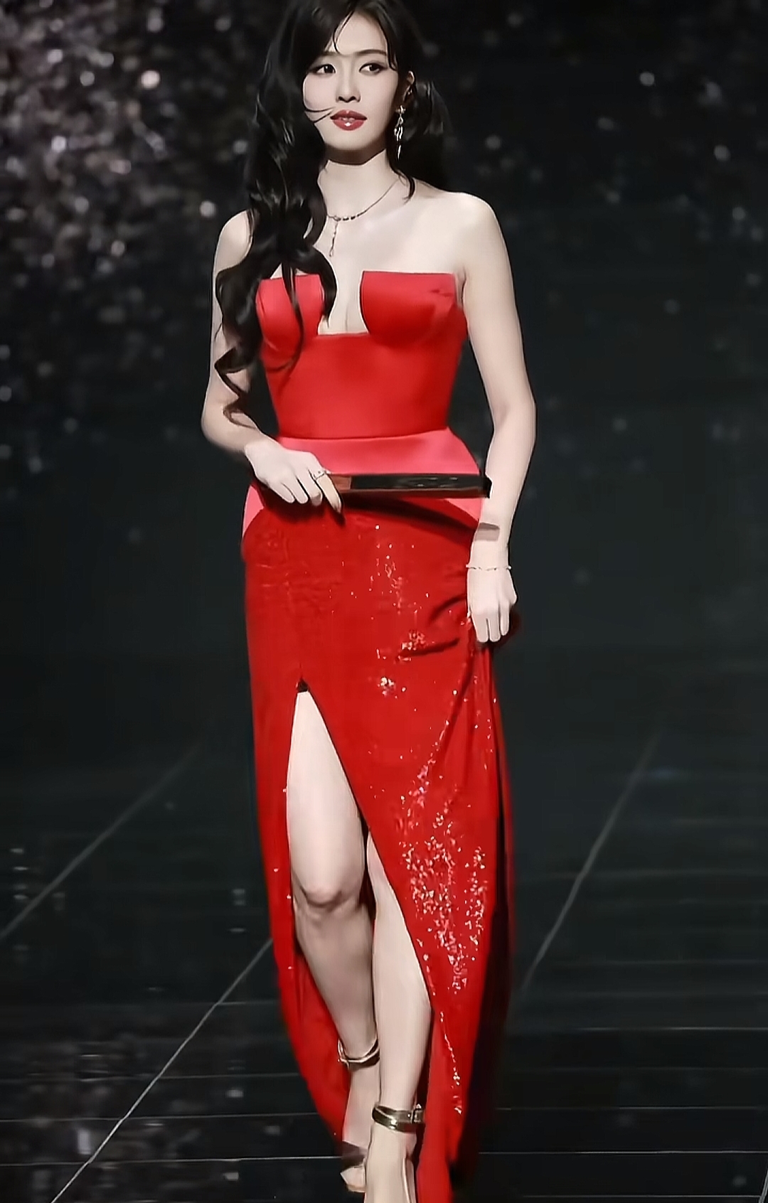 当天一身鎏金吊带礼服,大秀美腿,高开叉的露腿设计,往台上一站不仅不艳俗,反而有种美神降临的感觉。