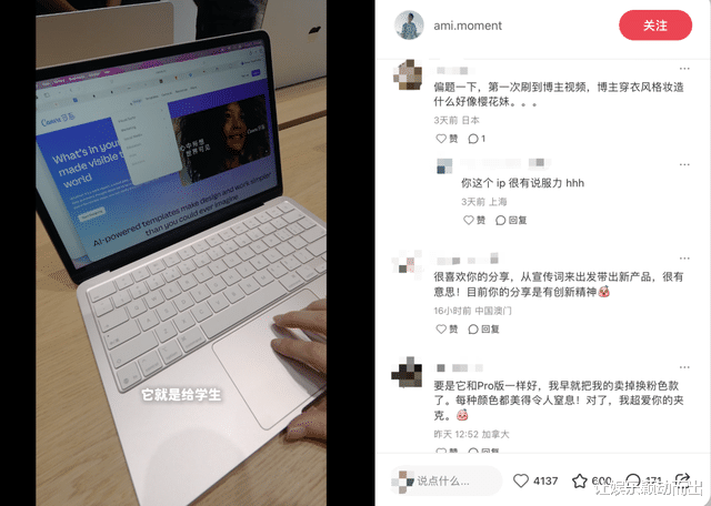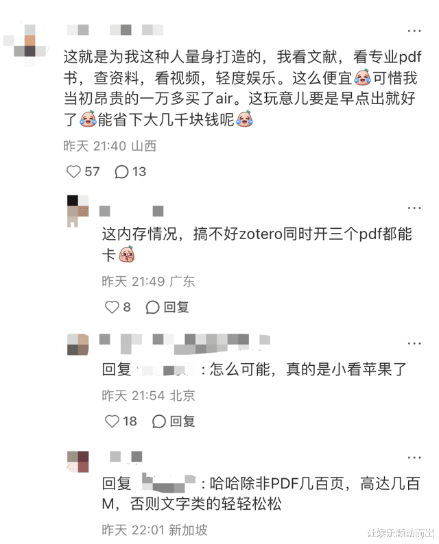 虽然阉割了不少性能,相比air几乎腰斩的价格,狠狠吸引了一波低预算的消费者,尤其是大学生、教师、轻办公人群、以及“没有深度工作只要轻松生活”退休人士。“看看网课,做做ppt和公众号够吗?”、“大学生,只用来写essay和做ppt够吗”......已经有不少学生党在各测评视频下咨询。