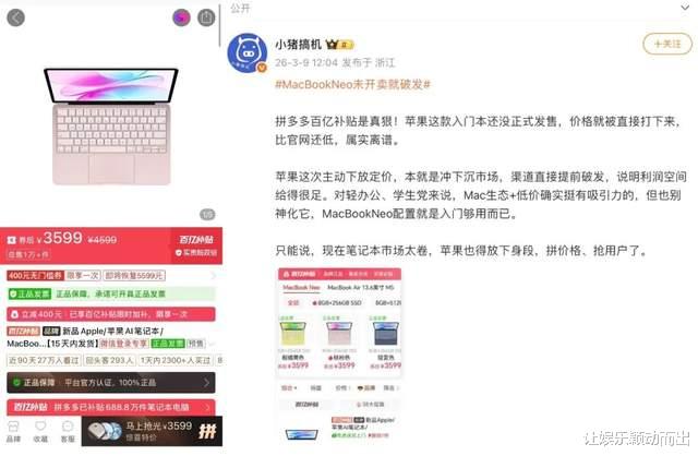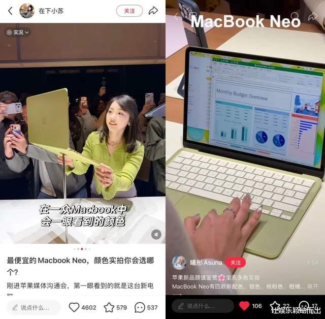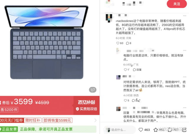 如果产品基础性能没毛病,那MacBook Neo显然是一个极其有效的拉新手段,承接住了负担不了Macbook air和pro,但想尝试苹果生态的消费者。“Macbook air和pro对自己而言价格太高,MacBook Neo则可以无负担闭眼入”,有消费者表示。