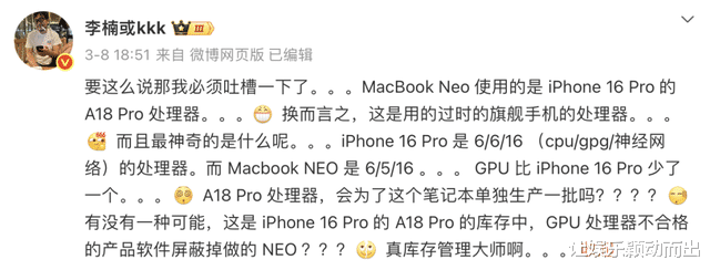 魅族前高管李楠发微博称“MacBook Neo是清库存行为”。有人支持,认为“硬件厂家传统套路”,有人反对,表示“为了碟醋包了顿饺子也不至于吧。”