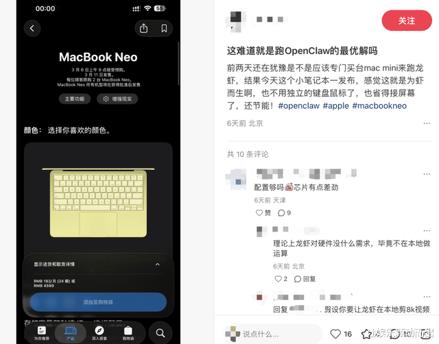 MacBook Neo发布后,很多“养虾人”开始将其视为首选。有网友分析,养虾主要是“调用云端大模型及少量的本地脚本或者文件操作,8G的运行内存够用。而且MacBook Neo功耗更低、价格更低、且更便携,甚至比Mac mini更适合运行openclaw。”