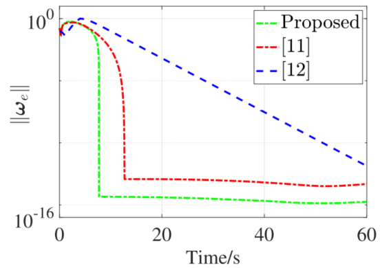 图2是角速度误差的对比。同样,本文控制器收敛最快,稳态误差最小。
