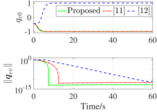 图1展示了三种控制器下的姿态误差轨迹。可以看到,对比的控制器出现了明显的退绕——标量部分从负变正又变负,绕了一大圈。本文的控制器和另一个抗退绕控制器都避免了退绕,但本文的收敛速度明显更快,最终精度也更高。
