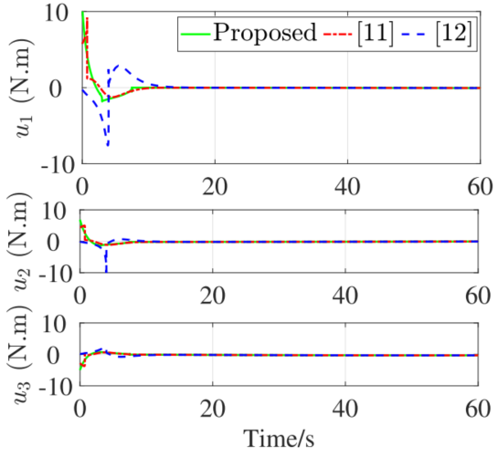图3是控制力矩的对比。两个对比控制器都有明显的抖振(高频振荡),而本文的控制器要平滑得多——这是边界层处理的功劳。
