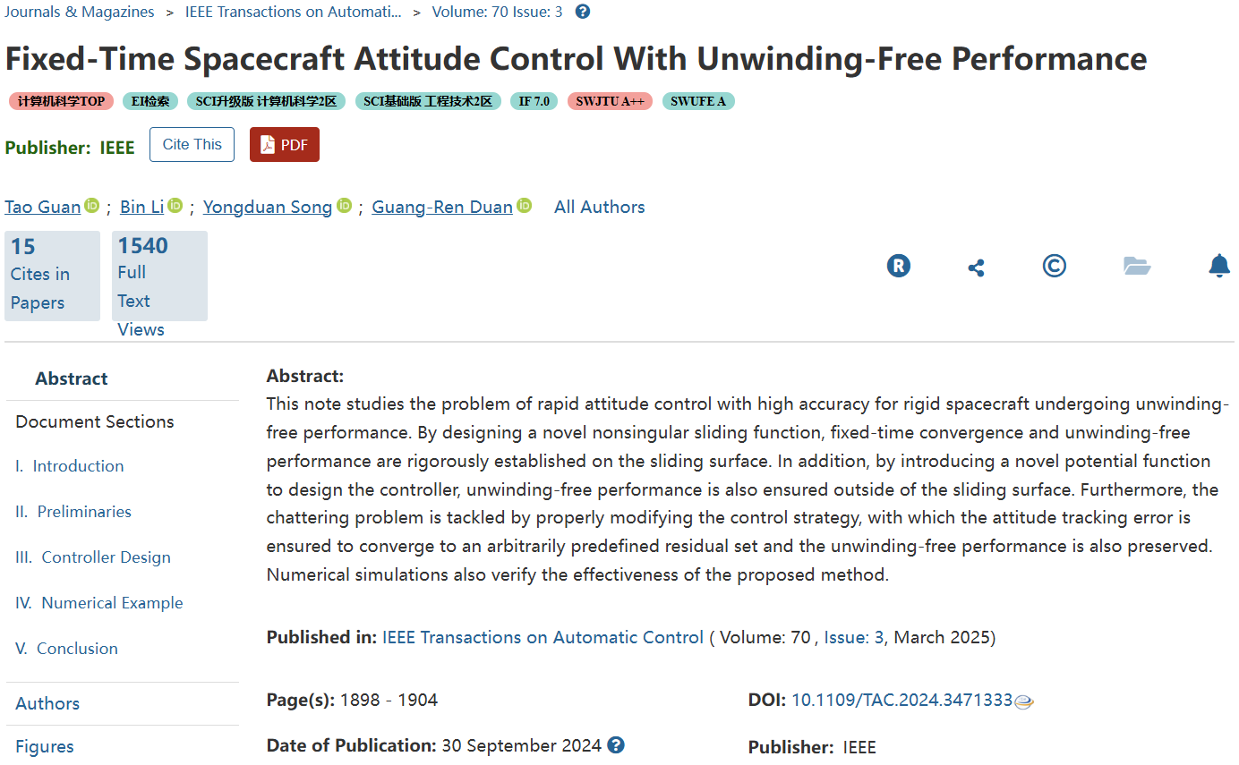 引文格式:Guan T, Li B, Song Y, et al. Fixed-Time Spacecraft Attitude Control With Unwinding-Free Performance[J]. IEEE Transactions on Automatic Control, 2025, 70(3): 1898-1904.