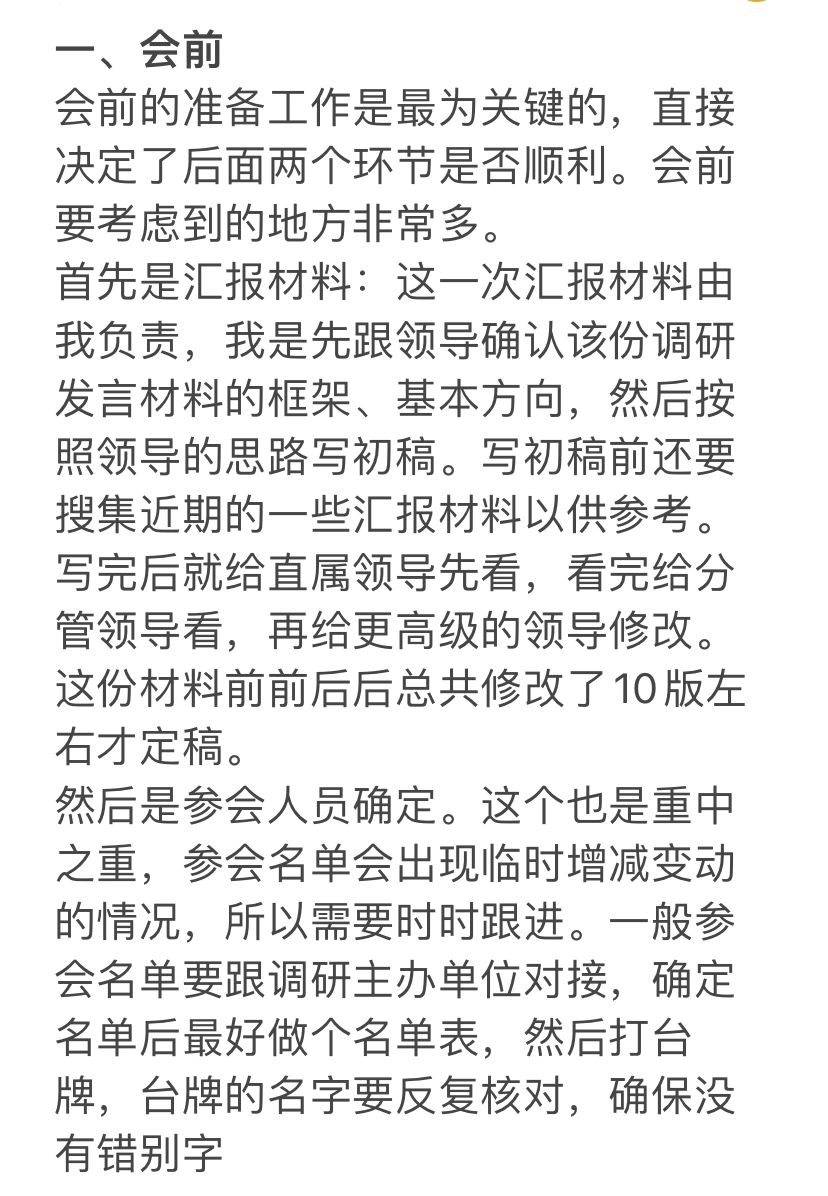 我很喜欢复盘思考自己的工作,每次一项工作结束后,我会回顾一下一些细节有没有做到位,哪些做得不好,每次都这样做就会让自己的效率更高。 上周刚结束了一场大型调研会,明天又有培训演练,趁经验还热乎,回顾了一下,复盘总结,供大家参考,也供自己思考。 · 我觉得任何会议最重要的无非就是三个环节:会前,会中,会后。逐一分享。如图。