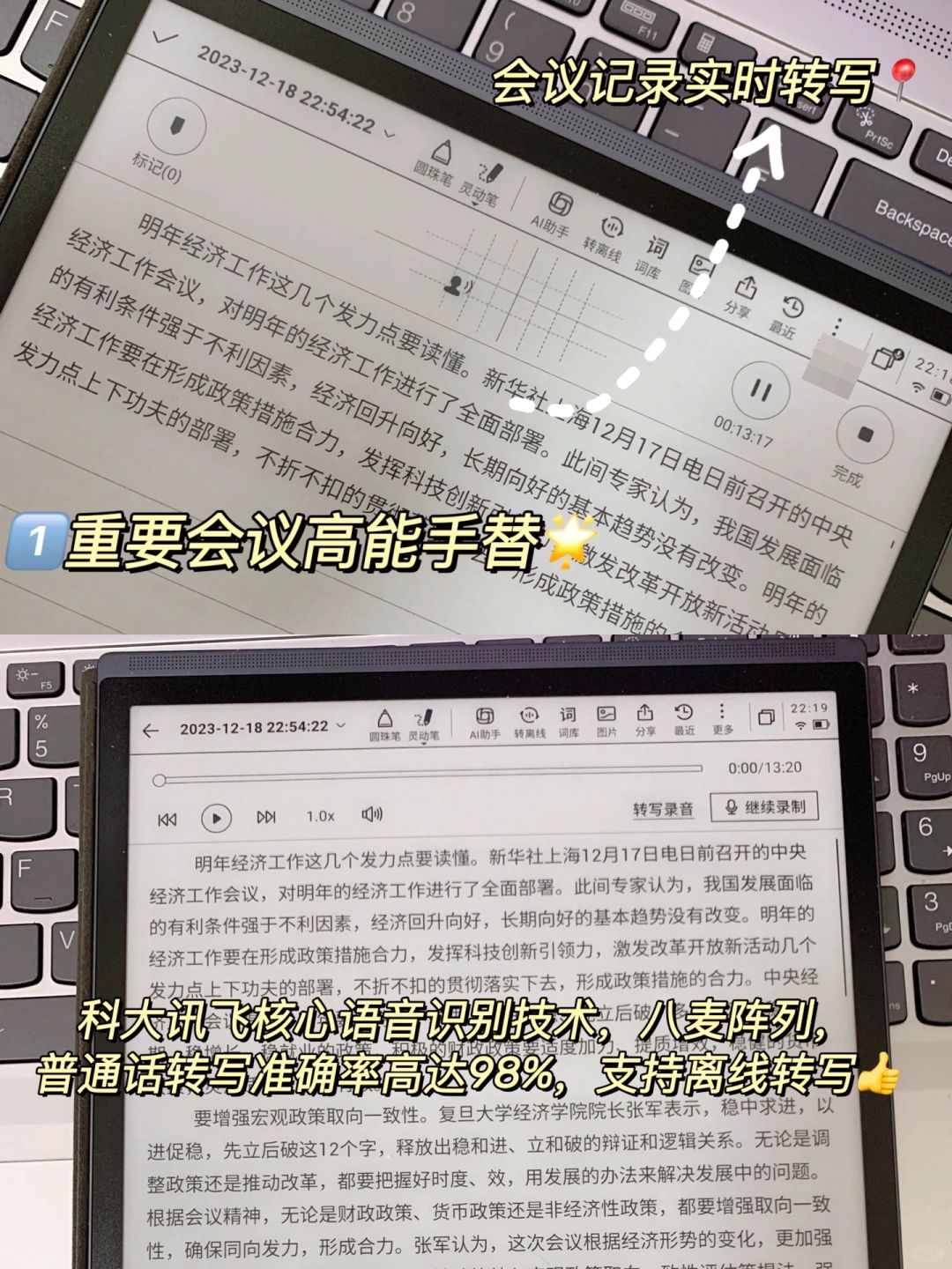 5.有机会一定要亲自统筹一场大型会议,所有机关行政工作都不难了。当你全流程经历过一场大会,所有工作的思路都通了。有机会统筹会议工作的话,我建议大家一定要使用科大讯飞办公本X3,因为最头疼的会议记录、会议纪要,讯飞办公本X3能轻松实现秒解决。它支持会议内容实时转写,因为科大讯飞核心语音识别技术,可以会议实时录音转写文字,普通话转写准确率高达98%。因为星火大模型的加持,还能够快速提炼整合成可读性更高的正式版会议纪要