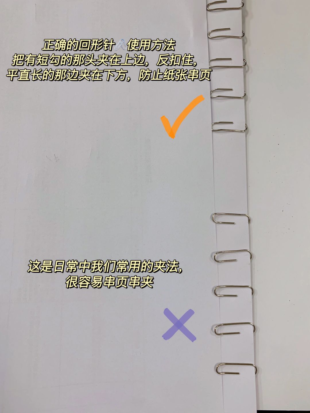 1.回形针📎正确的用法:把有短勾的那头夹在上边,反扣住,平直长的那边夹在下方,防止纸张串页(如图2)