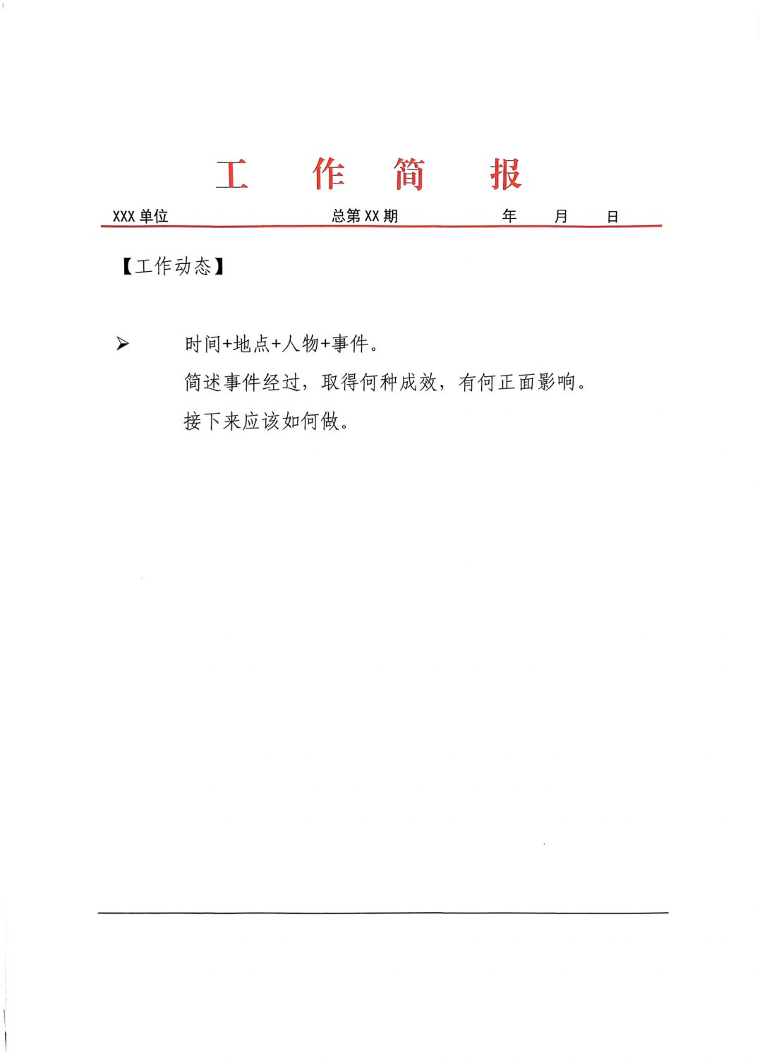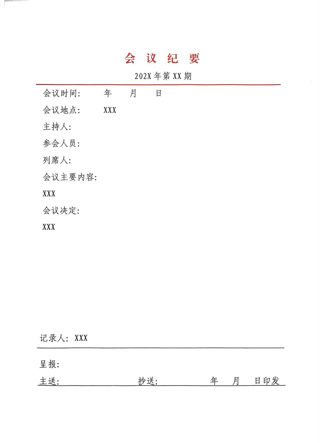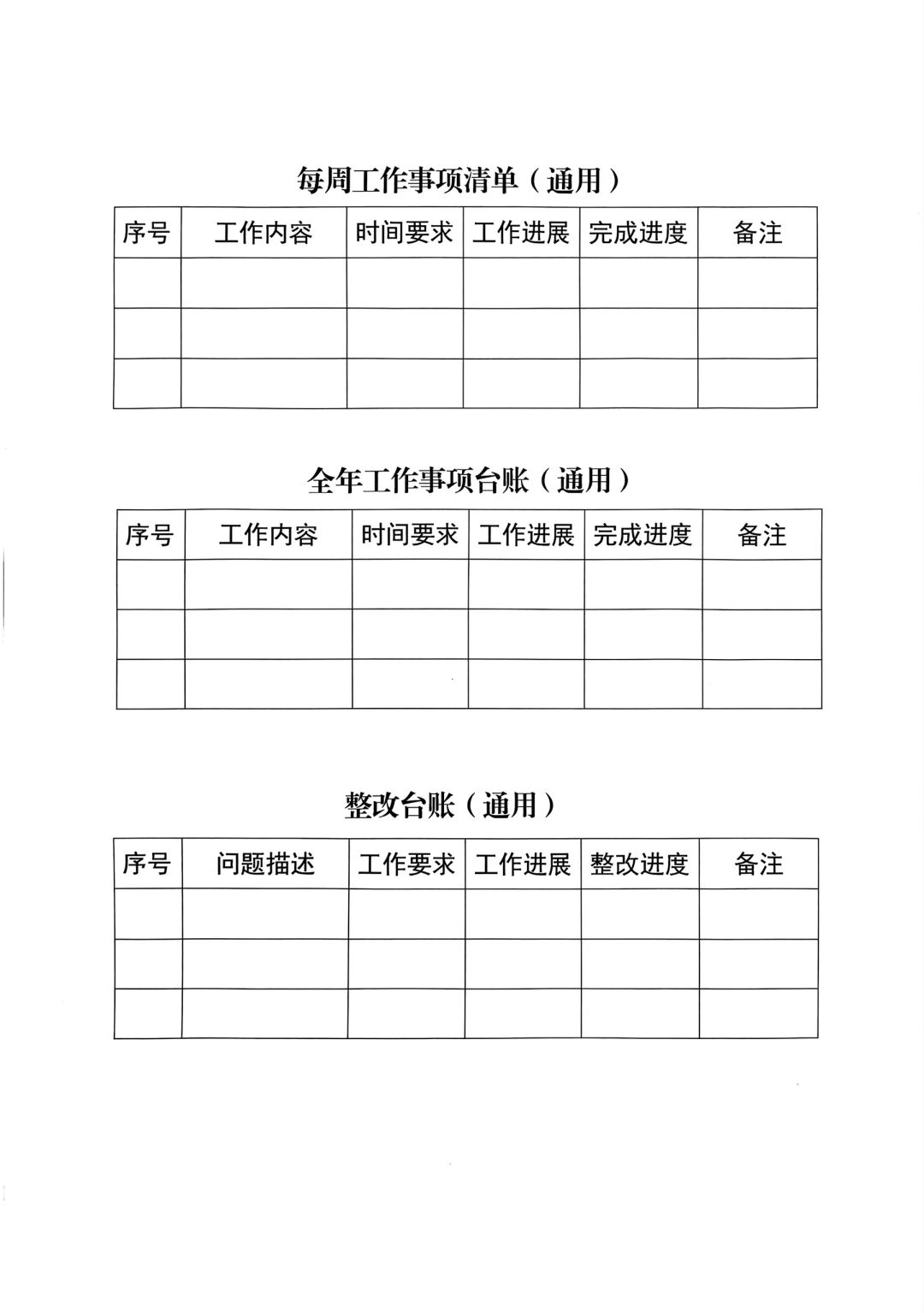 比如会议记录、会议纪要、工作简报。这方面其实很多单位都有对应的会议记录本,没有会议记录本的可以借鉴上述模版形成符合单位实际的表格。另外,还有公文通用格式,很多人总是用不好,或者记不住,可以打印出来放在电脑桌,要用的时候对照一下,就能减少公文格式错误。还有一些工作任务清单、整改台账,都可以使用模版,减少耗时。
