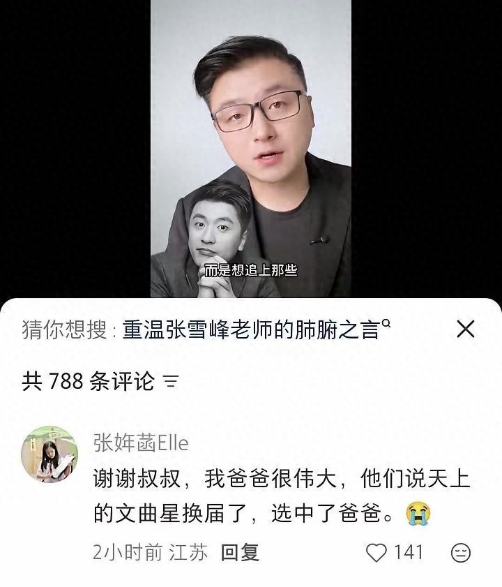 之前,主持人沈南发布悼念张雪峰的视频,张姩菡曾在评论区留言:“谢谢叔叔,我爸爸很伟大,他们说天上的文曲星换届了,选中了爸爸。”