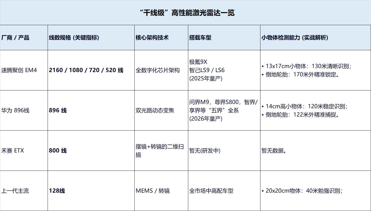 • 华为 896:此次发布的 896 线量产激光雷达,以全球量产最高线数的实力,为高线数激光雷达的规模化普及打开全新赛道。产品采用首创的双光路一发两收(广角 + 长焦)架构,完美兼顾广角视野与长焦探测需求,分辨率较上一代 192 线产品实现四倍提升,小物体检测能力同样亮眼,可在 120 米外识别 14 厘米高的低矮障碍物,122 米处识别倒地轮胎,复杂天气与路况下的感知稳定性大幅增强。该产品首发搭载于问界 M9、尊界 S800,后续还将全面覆盖鸿蒙智行 “五界” 以及“华系”更多车型,为高线数激光雷达的市场渗透筑牢基础。