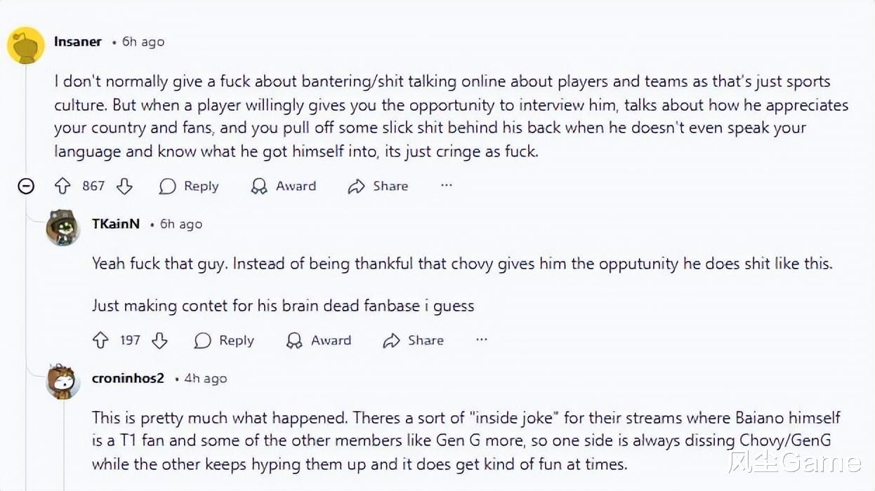 GEN晋级赛开打之前,队内中单选手Chovy,爆发了一波大节奏,起因是击败京东之后,大超在接受采访时,被一位自称“T1和Fake头号粉丝”的巴西主播,贴脸嘲讽了,这位名为Baiaon的主播,是跟巴西联赛官方合作的二路解说,今年先锋赛在主场,巴西官方给了他采访选手的机会。