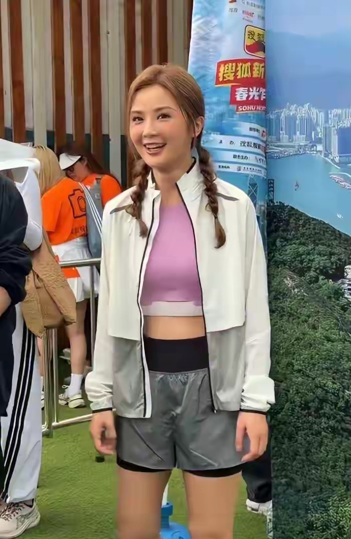 再看43岁的阿Sa,真的很拼。她扎着清爽的双麻花辫,一身运动装露出清晰的马甲线,跑步时活力满满,看上去元气满满。不过生图里能看到她的眼袋和黑眼圈,看上去多少有点疲惫,毕竟女明星平时工作也累。