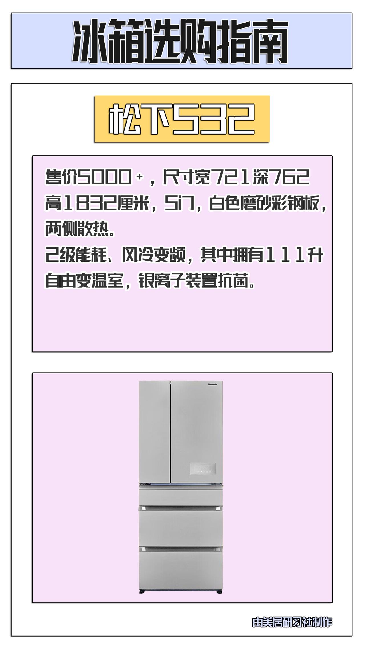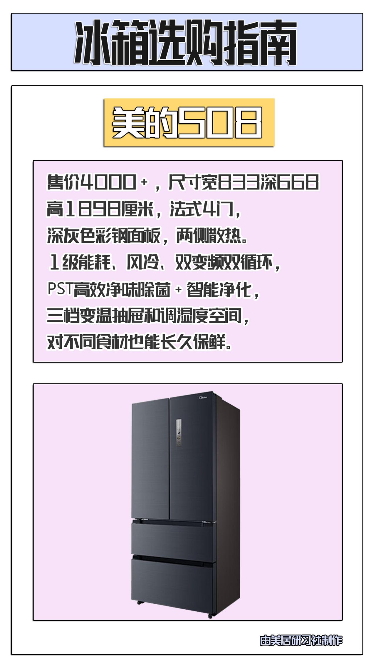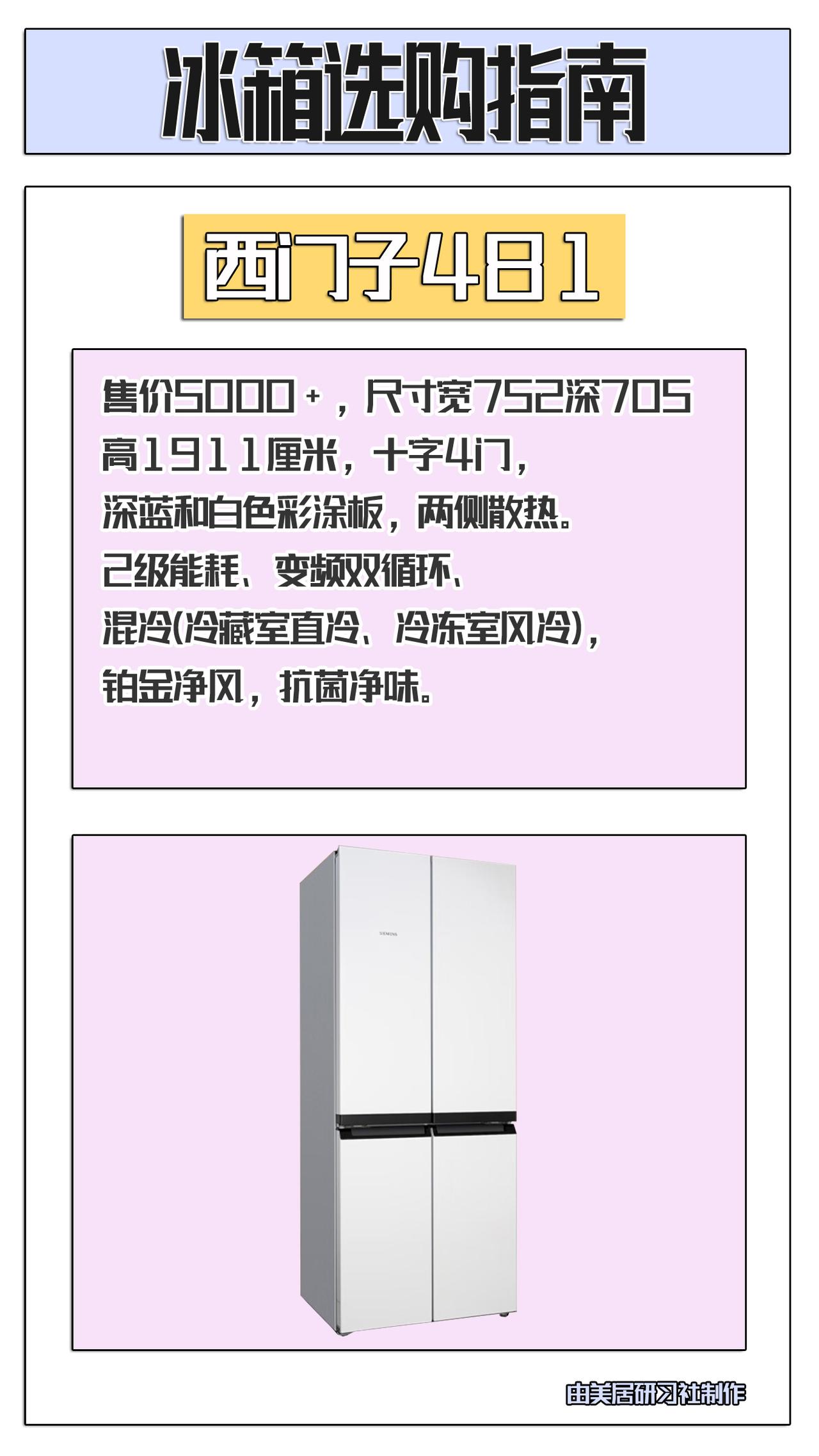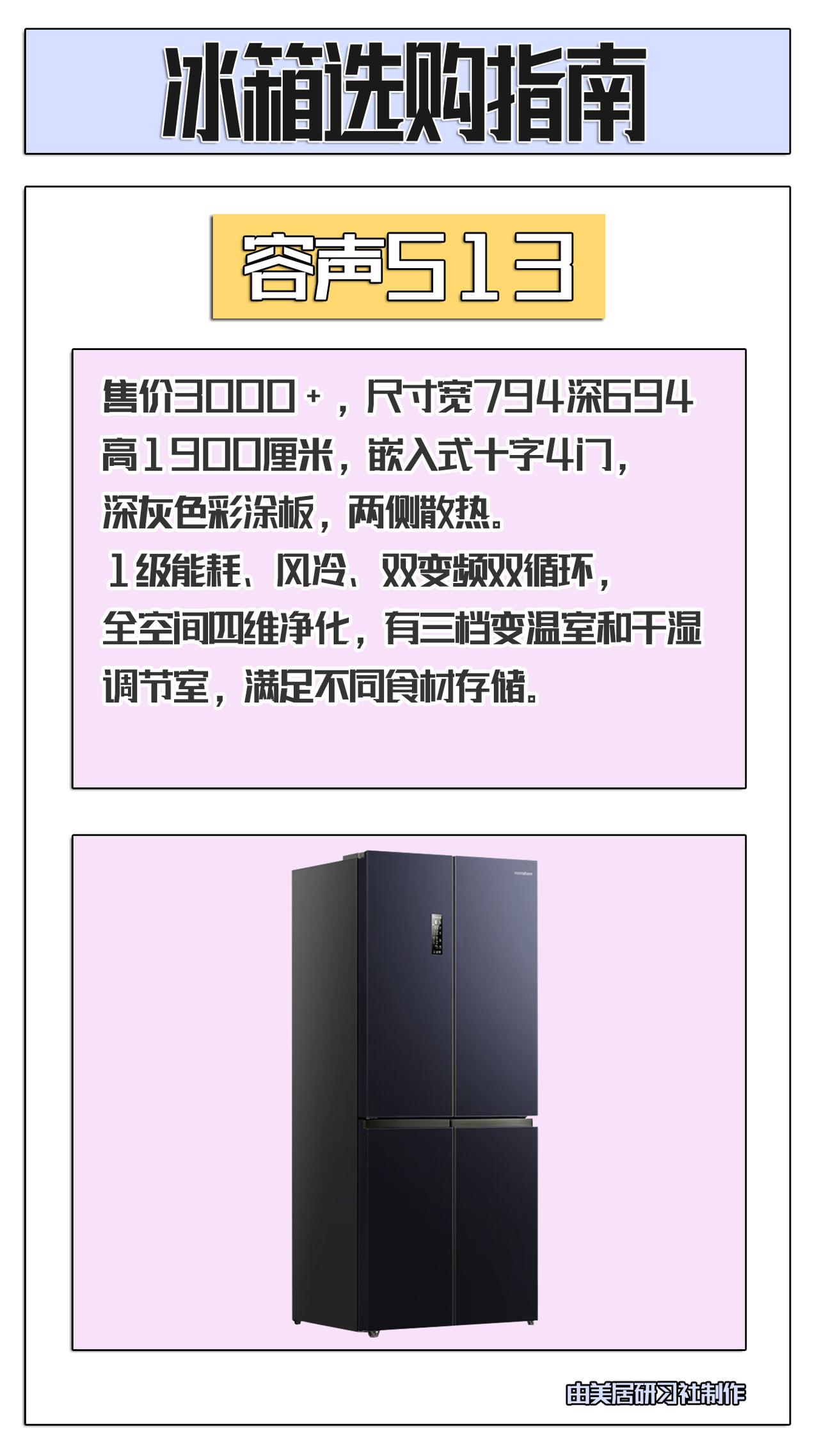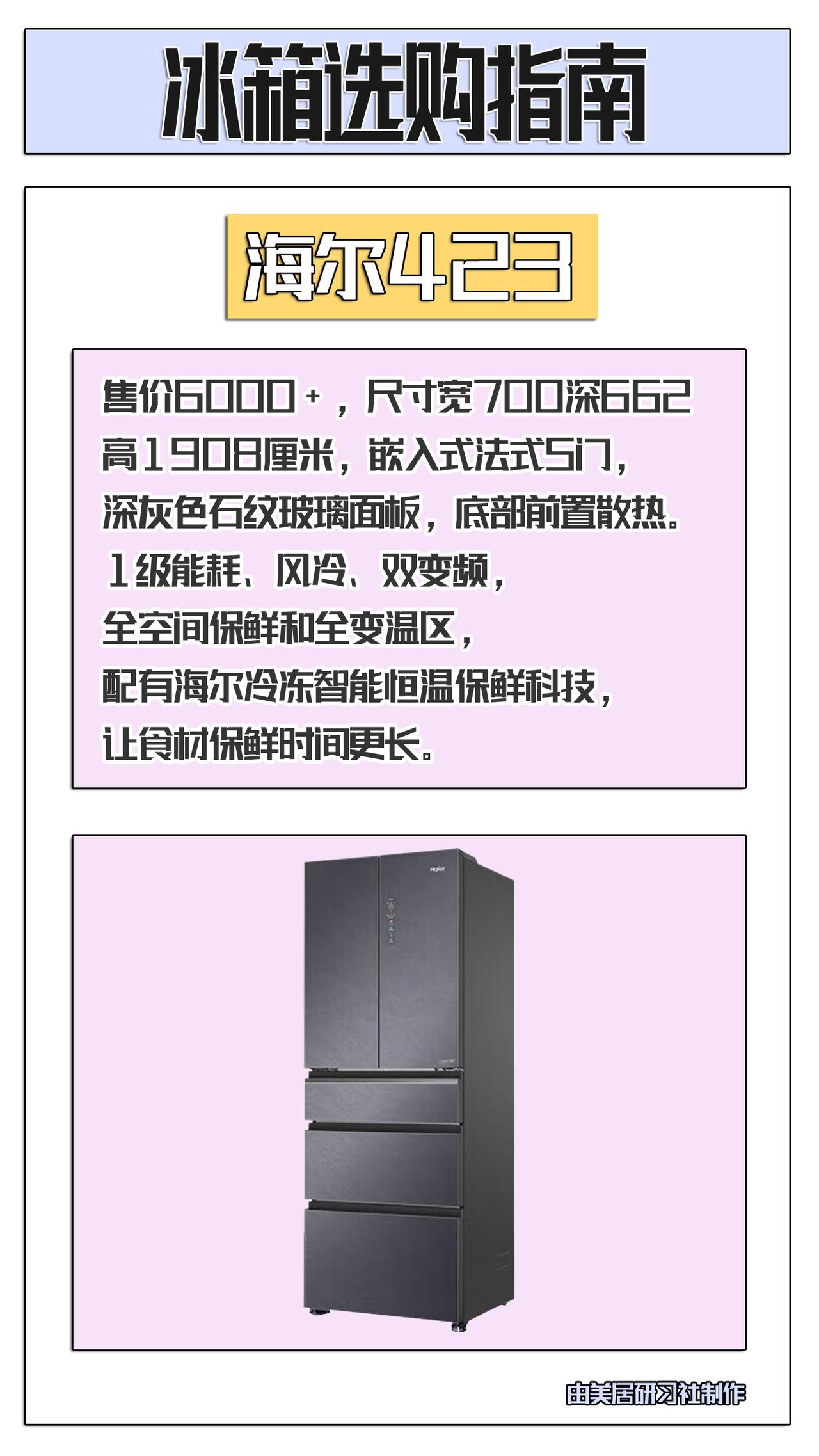 选择一款合心意的冰箱,确实能提升居家幸福感,减少很多烦恼,选购时建议要看以下5点: 1、能耗等级 选1级或2级,两者相差不会很大,其它等级别选。 2、制冷方式 选混冷和风冷,不结霜、保鲜效果好; 不选传统的直冷,会结霜、保鲜也不太好。 3、循环系统 选两循环或三循环制冷,冷藏和冷冻独立循环,有效隔绝串味发生; 不选单循环制冷,容易串味,影响食材品质。 4、运行方式 选变频或双变频,自动调节温度,室温控制更精准,能耗低、声音小; 不选定频,制冷较稳定,能耗高、噪音大。 5、容量 选400L以上,可按人均70~100L,若位置允许,建议容量越大越好。 海尔423 售价6000+,尺寸宽700深662高1908mm,嵌入式法式5门,深灰色石纹玻璃面板,底部前置散热。 1级能耗、风冷、双变频,全空间保鲜和全变温区,配有海尔冷冻智能恒温保鲜科技,让食材保鲜时间更长。 美的508 售价4000+,尺寸宽833深668高1898mm,法式4门,深灰色彩钢面板,两侧散热。 1级能耗、风冷、双变频双循环,PST高效净味除菌+智能净化,三档变温抽屉和调湿度空间,对不同食材也能长久保鲜。 西门子481 售价5000+,尺寸宽752深705高1911mm,十字4门,深蓝和白色彩涂板,两侧散热。 2级能耗、变频双循环、混冷(冷藏室直冷、冷冻室风冷),铂金净风,抗菌净味。 容声513 售价3000+,尺寸宽794深694高1900mm,嵌入式十字4门,深灰色彩涂板,两侧散热。 1级能耗、风冷、双变频双循环,全空间四维净化,有三档变温室和干湿调节室,满足不同食材存储。 松下532 售价5000+,尺寸宽721深762高1832mm,5门,白色磨砂彩钢板,两侧散热。 2级能耗、风冷变频,其中拥有111L自由变温室,银离子装置抗菌。