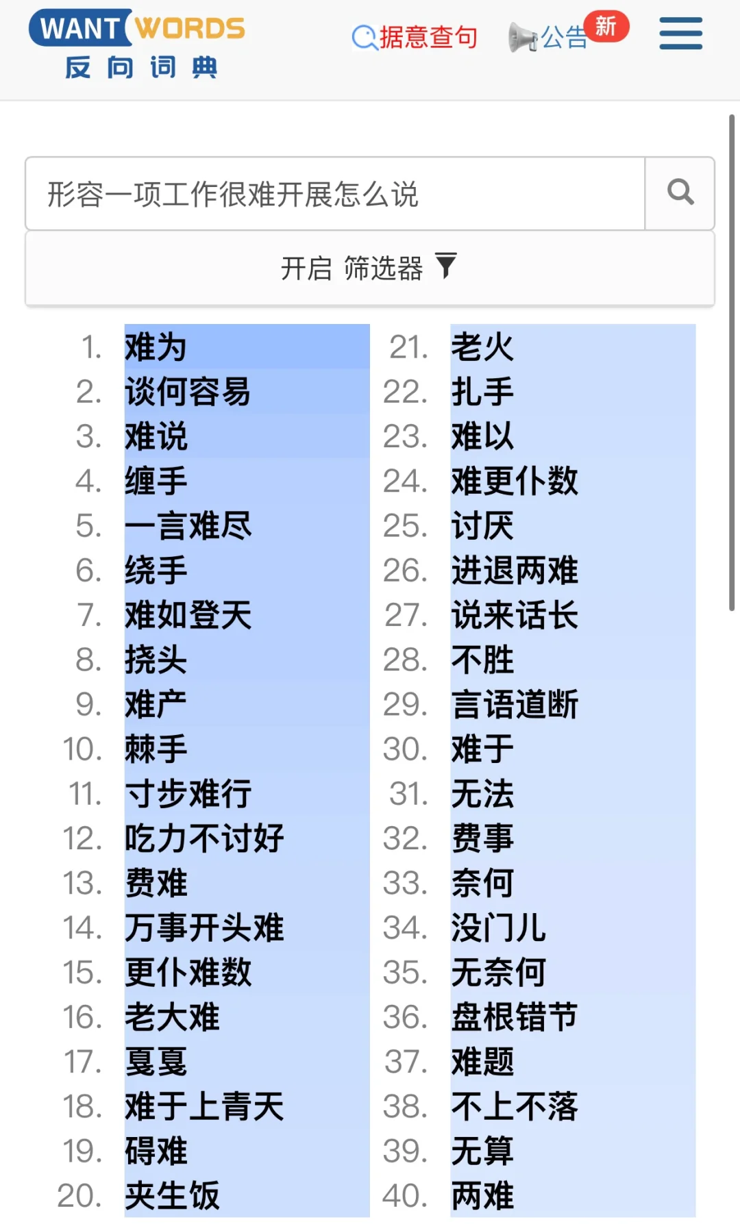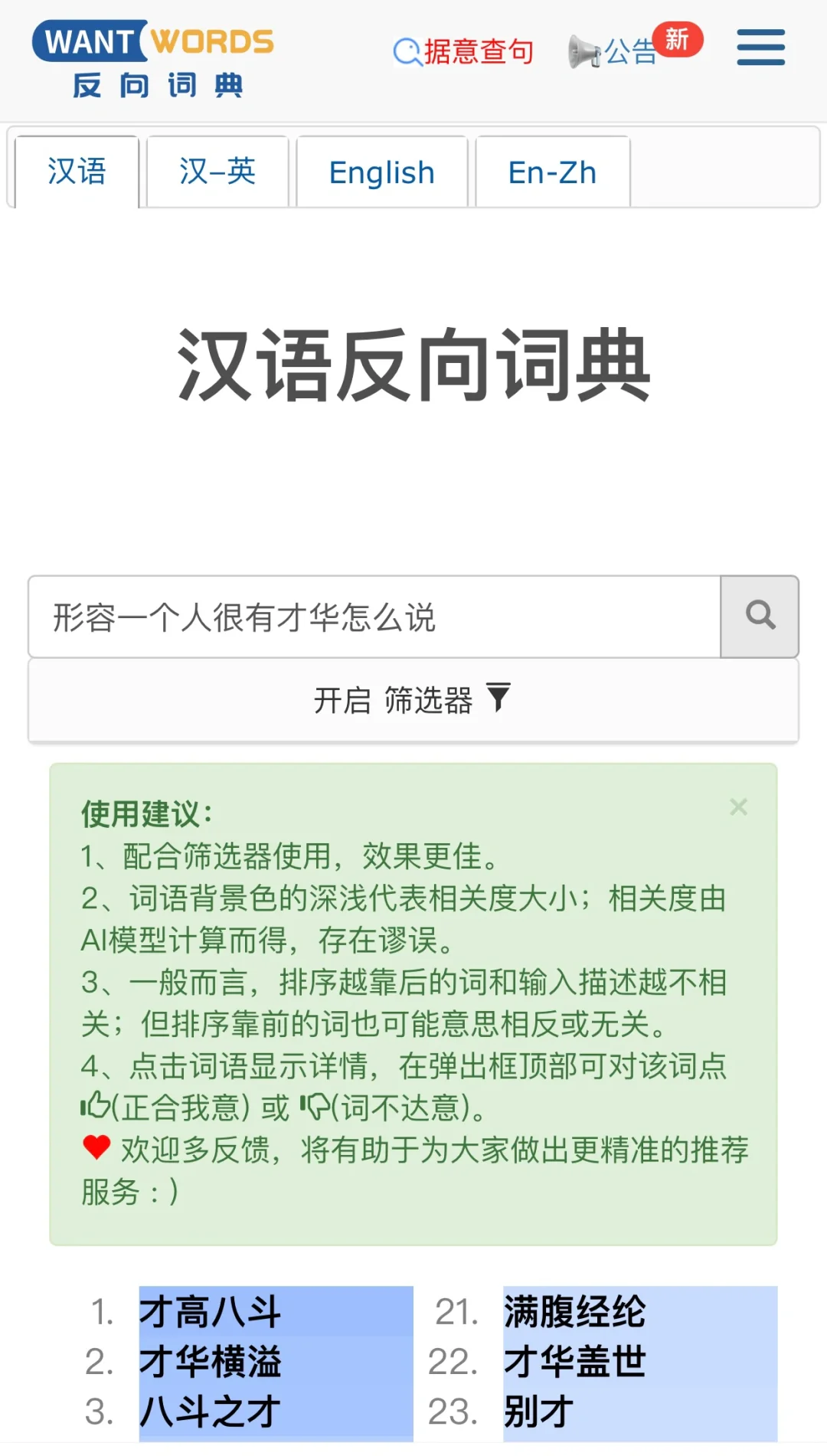 有些人总觉得表达能力弱,开口不知道说什么。写东西也没料,憋了大半天只有两行字。其实只是你词汇储备少!!这个神器能帮你解决这个困扰!只要输入你想要表达的信息,就可以找到对应词汇。如:“形容一个人很有才华怎么说”“形容一件事很难开展怎么说”。
