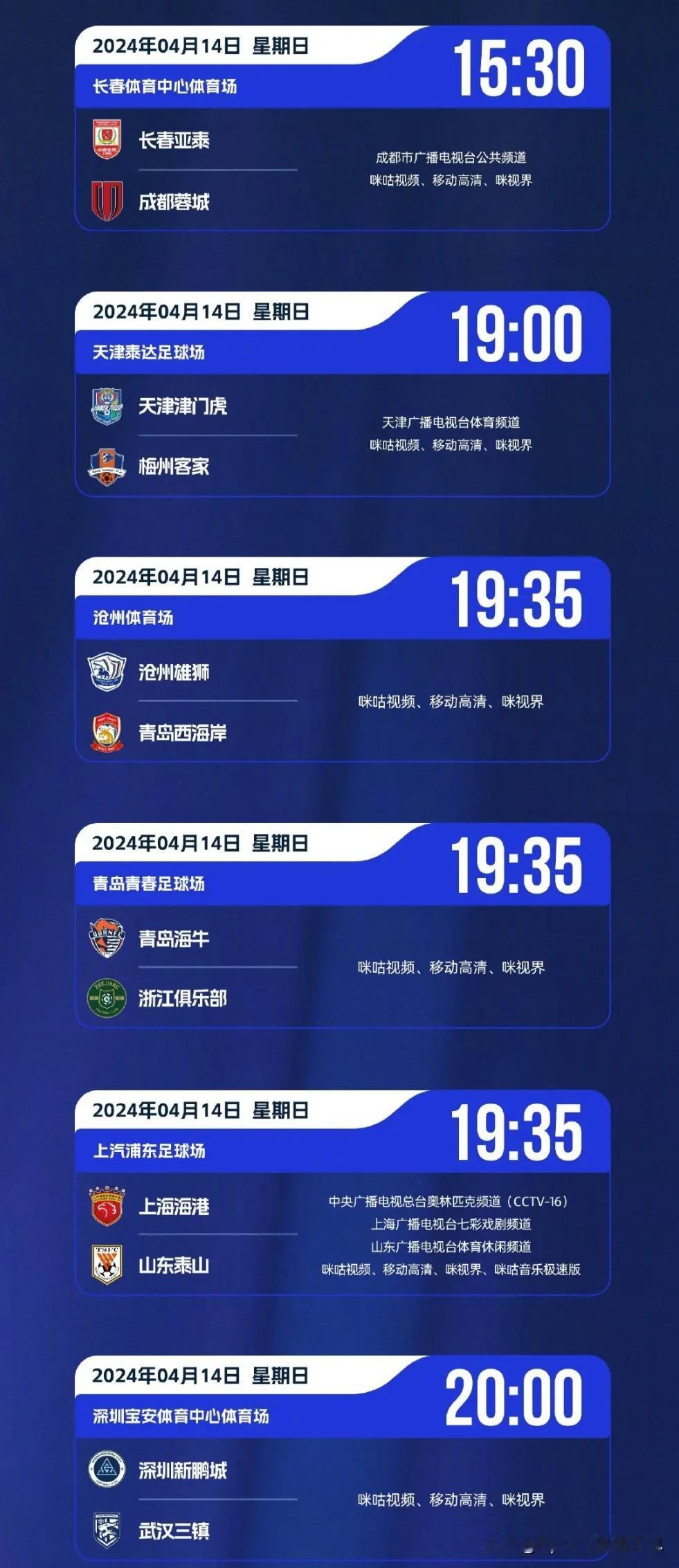 中超联赛4月14日赛程、直播预告: