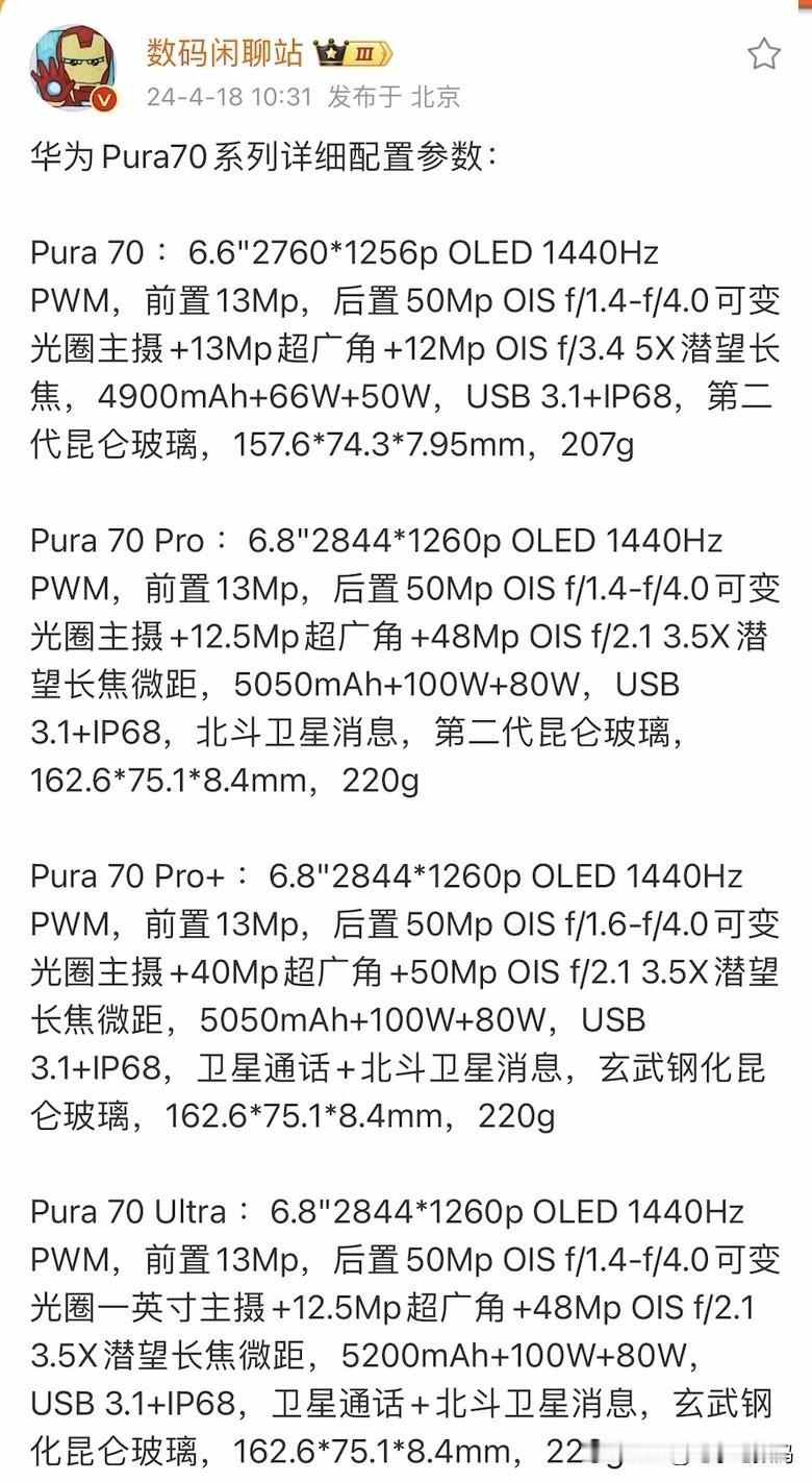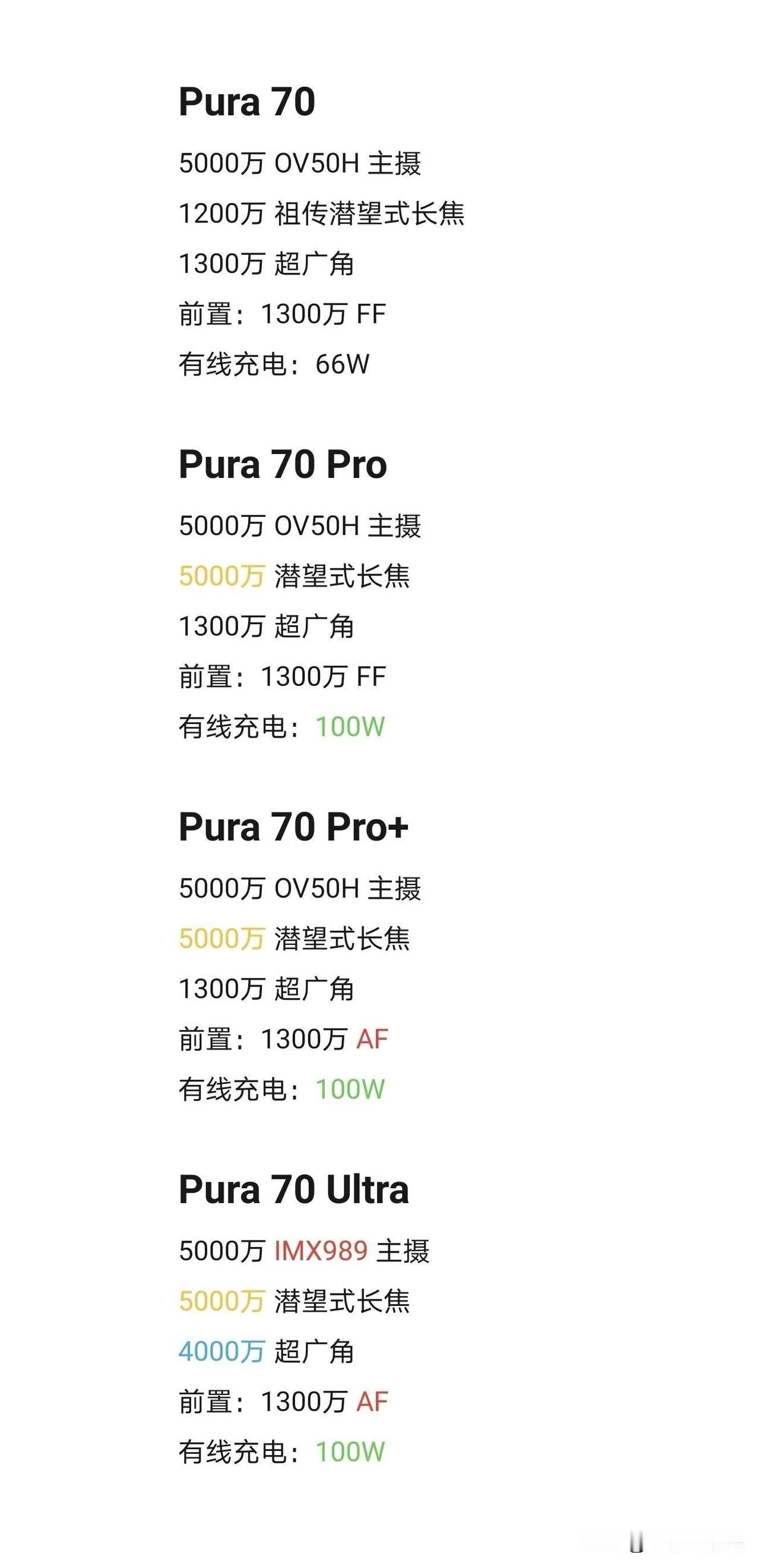 华为 Pura 70 Ultra和Pro的真机外观,和几款机型的具体配置来了~ 期待华为影像旗舰的,这次不用犹豫,几款机型都是相当可以! 特别是这次的Pura 70 Ultra ,可以说硬件配置已经完全达到了目前的一流水准,搭配上华为的优化,拍照体验肯定不会让人失望,而且外观是真的好看! 另外三款虽然是采用的豪威OV50H主摄,但可变光圈+潜望长焦的体验相信也不会差。 而且除了影像方面,其他配置也都不错,定价相对来说也没特别离谱,就是抢购的体验不太好,不着急换机的可以多等等~