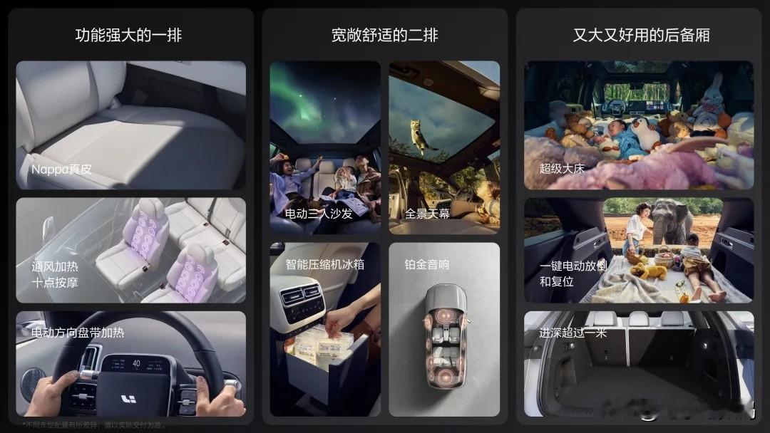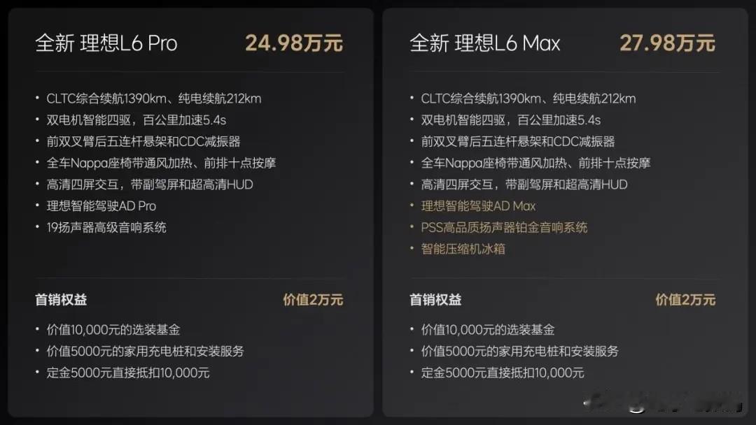 理想L6是真的惨[笑哭]!被同天的华为Pura 70和雷军直播把热度吸的是一点不剩啊~ 不过看到最终的定价感觉还是挺有诚意的,Pro售价为24.98万元起,Max售价为27.98万元起。 该有的配置基本都有,看着豪华感也不算差。 定位属于中大型SUV,长宽高为4925×1960×1735mm,轴距为2920mm。 外观采用了家族式设计,与L7、L8、L9车型基本保持一致,标志性的星环大灯很亮眼。 采用1.5T四缸增程器+前后双电机增程式混动系统,CLTC综合续航1390公里,纯电续航212公里。全系标配智能四驱和CDC运动悬架,配备8295P芯片,超高清HUD也是标配。 车载冰箱、全景天幕和顶级音箱等配置也都同样不少。 另外智驾方面分为两个版本,AD Pro以纯视觉为主,可实现BEV大模型的高速NOA、城市LCC、复杂车位的智能泊车。AD Max 则是拥有更高规格的硬件配置,新增收费站通行、城市LCC增加代驾指挥、城市NOA也将逐步开放到全国所有路段。 不知道各位觉得如何?
