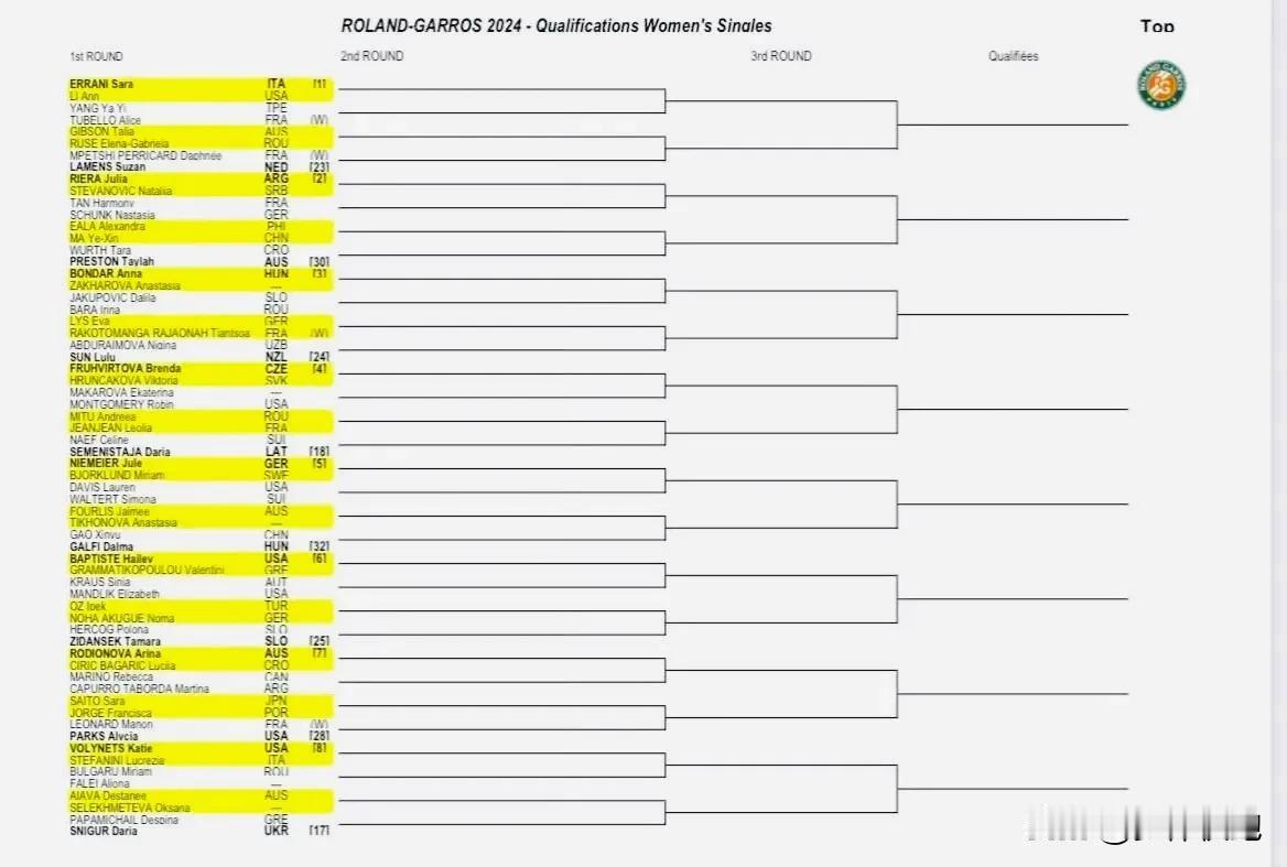 法网女单资格赛明日开打,本次共有四名中国金花获得资格,其中具体签表如下,一场都不好打,祝好运!