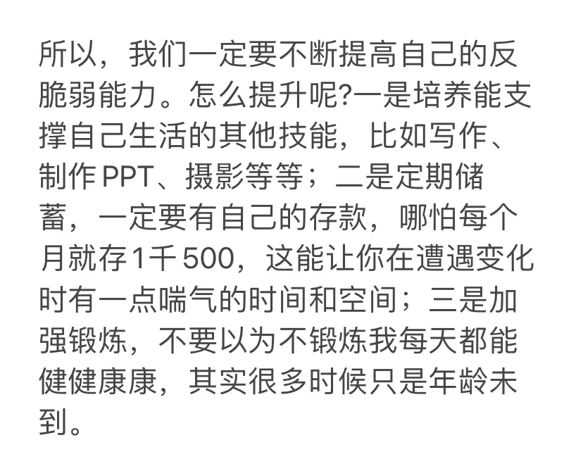 我也走过很多弯路。我没有一个明确的指路人告诉我大学毕业后的职场规划应当如何,是考银行还是考公考编,没有一个人跟我分析利弊,让我在评估各种因素下做出正确的选择;也没人告诉我在小县城就业和安家稳定和风险系数如何,是带来了一眼就看得到尽头的安逸还是遇挫时想逃都逃不了的这座围城的无奈。当然,恋爱结婚后也没有一个人告诉我,你放心好了,我养你。