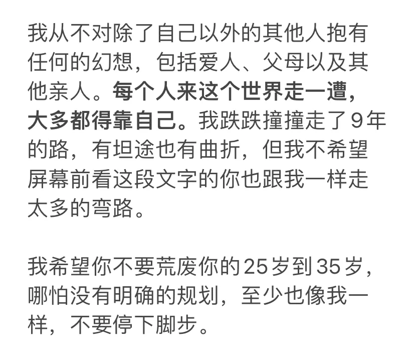 我从不对除了自己以外的其他人抱有任何的幻想,包括爱人、父母以及其他亲人。每个人来这个世界走一遭,大多都得靠自己。我跌跌撞撞走了9年的路,有坦途也有曲折,但我不希望屏幕前看这段文字的你也跟我一样走太多的弯路。