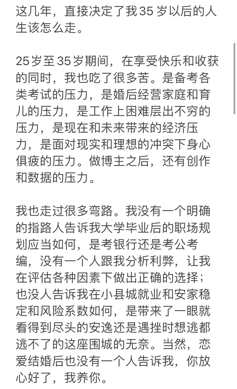 25岁至35岁期间,在享受快乐和收获的同时,我也吃了很多苦。是备考各类考试的压力,是婚后经营家庭和育儿的压力,是工作上困难层出不穷的压力,是现在和未来带来的经济压力,是面对现实和理想的冲突下身心俱疲的压力。做博主之后,还有创作和数据的压力。