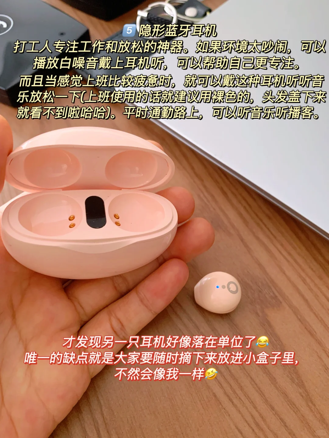 打工人专注工作和放松的神器。播放白噪音戴上耳机听,让自己更专注。上班比较疲惫时,可以听听音乐放松一下(上班使用的话就建议用裸色的,头发盖下来就看不到啦哈哈)。通勤路上可以听音乐听播客