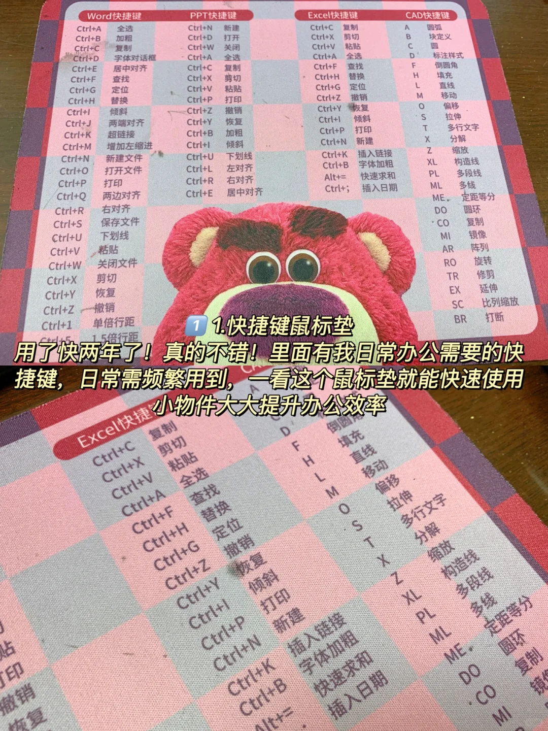 用了快两年了!真的不错!像我在办公室经常要用到word、Excel、PPT,有时工作一忙很容易出错。里面有我日常办公需要的快捷键,一看这个鼠标垫就能快速使用,小物件大大提升办公效率