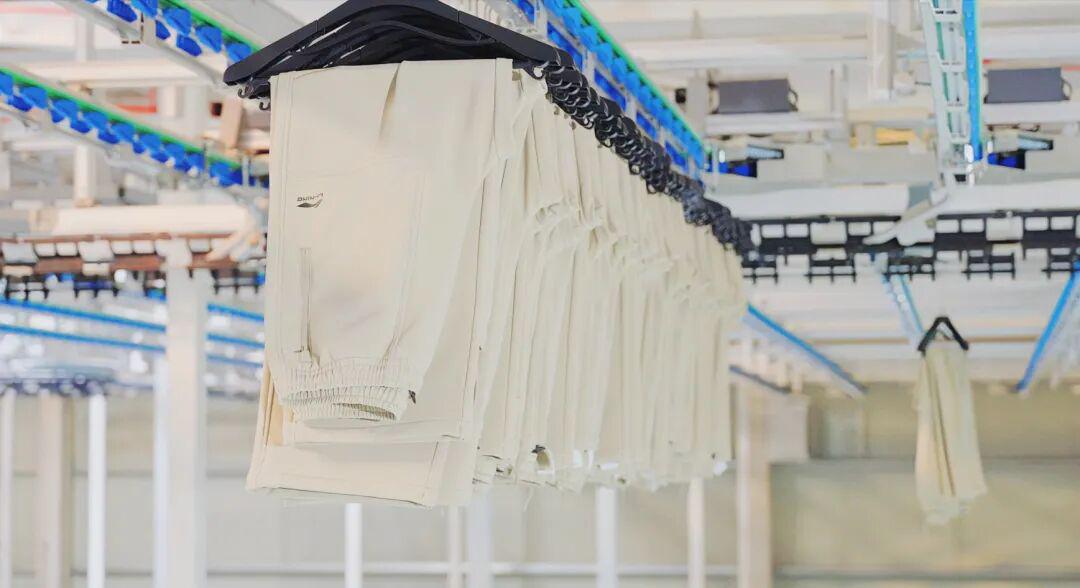 与传统服装车间不同,这座2万平方米的数智化厂房内,各环节操作台上方均安装了智能悬吊系统,被工人们称为“空中走廊”。上一工序的操作员将衣服裁片挂在头顶的悬吊衣架上,系统根据预设工序,自动规划最优路径,将物料传送至下一工位。这一设计减少了物料搬运、捆扎、传送的人力成本,优化了生产流程,实现人机协同与生产“不断流”。