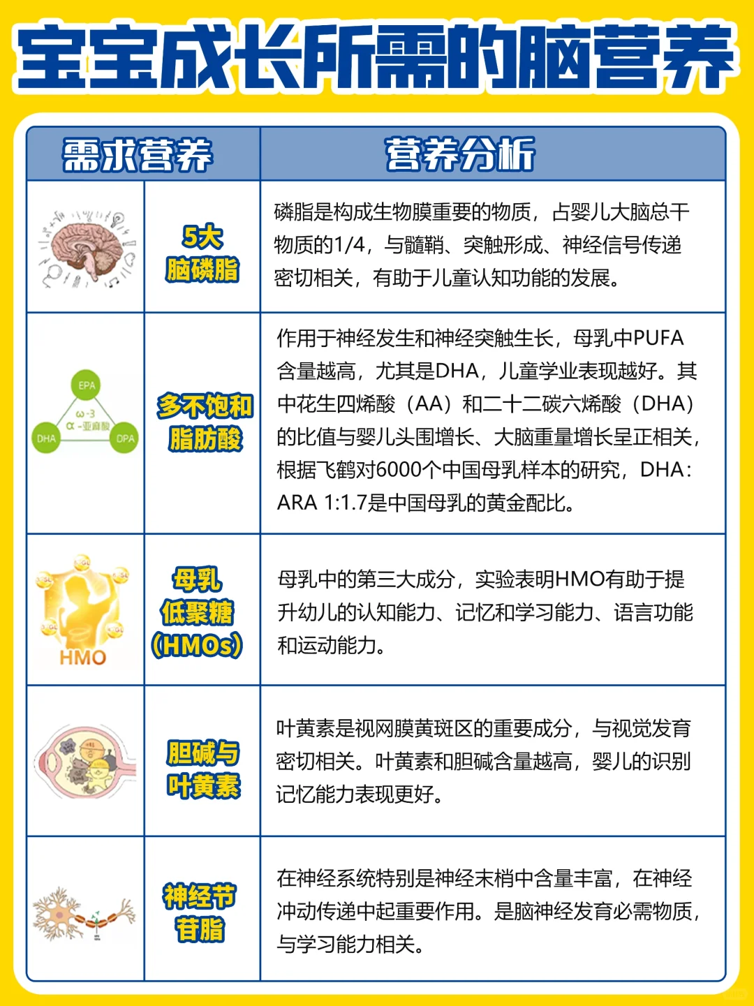 这是孩子生长发育重要的”黄金期“尤其是大脑发育!新生儿大脑重量大约是成人的约25%,而到了3岁脑重量已经基本达到了成人的85%!!!错过不可逆,为了不让孩子输在起跑线上。我一直非常注重孩子平时的早教和营养,不过呢,单一营养无法满足大脑发育所需,多重营养组合优势更明显。像脑磷脂群、DHA、ARA、HMOs母乳低聚糖等关键脑营养成分从宝宝出生就可以开始补充了