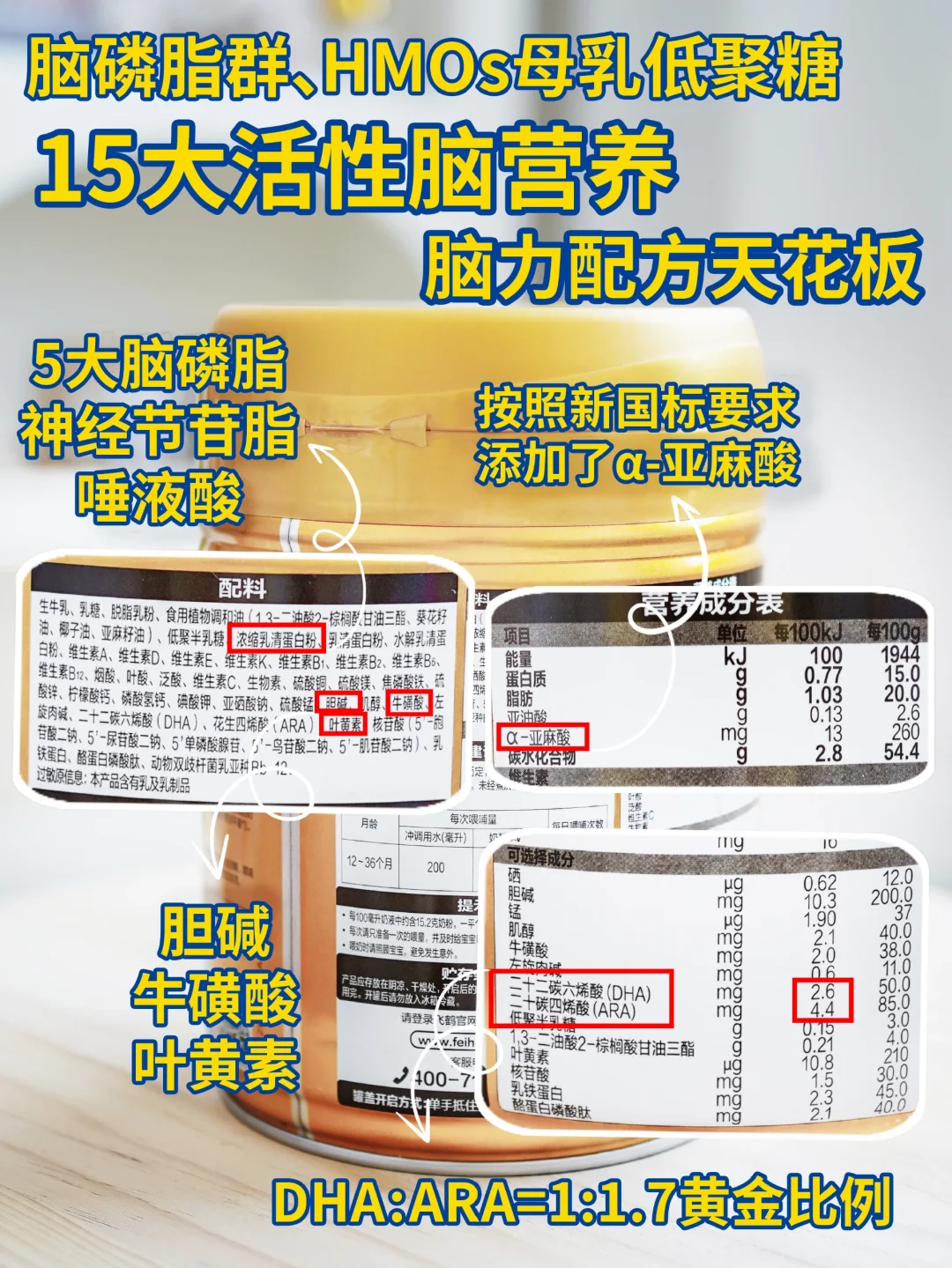 DHA是宝宝大脑和视觉发育的必需脂肪酸,有助于提升注意力和记忆力。不过呢。要注意DHA和ARA的科学配比