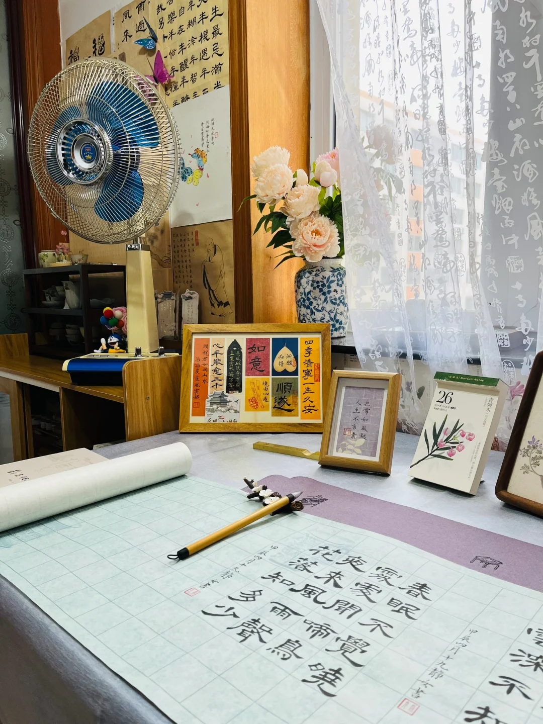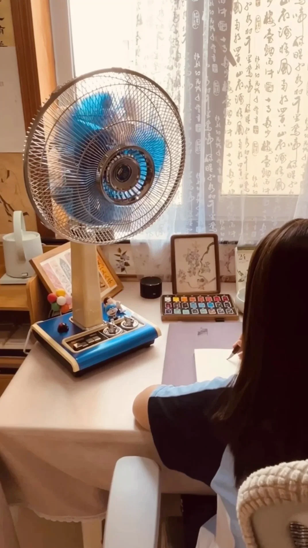 女儿在案前写着作业 ,风扇悠悠转动,哆啦A梦和大雄在午间小憩...