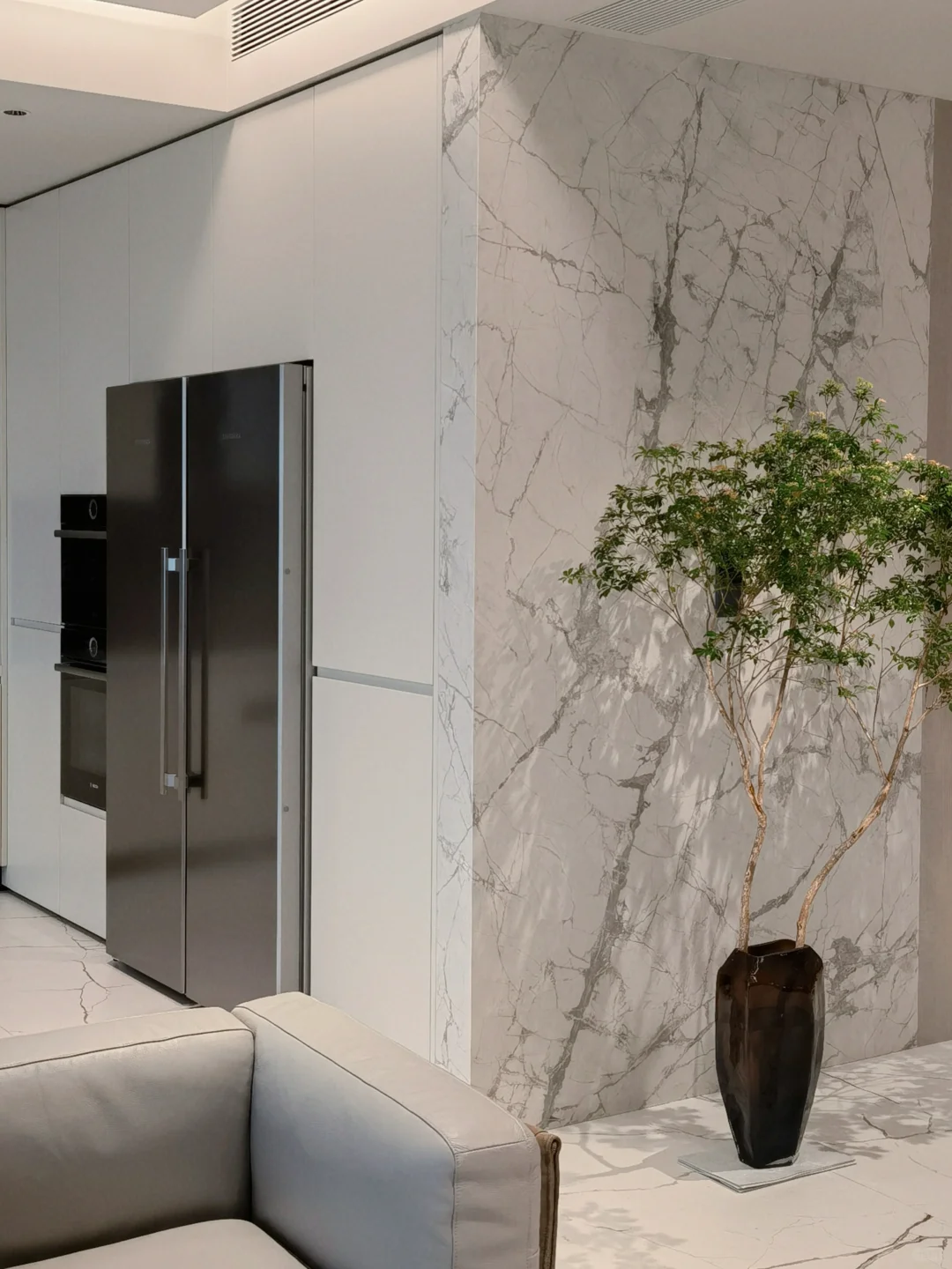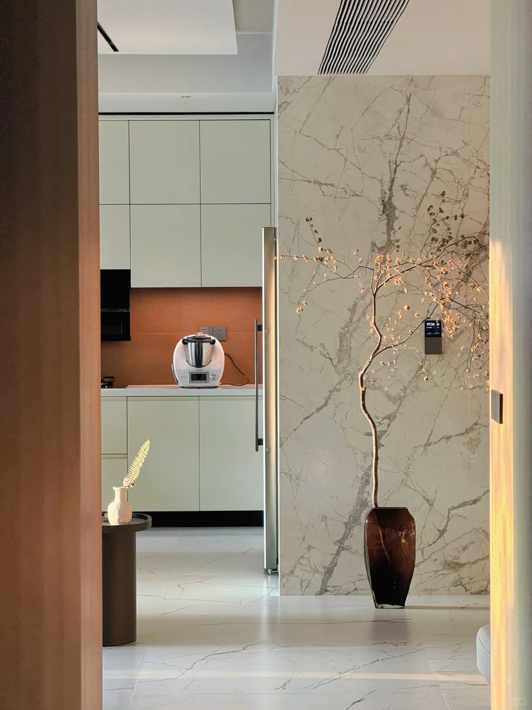 运用奢石纹理做点缀:玄关离窗远,光线不好,我选了浅色奢石纹路岩板(P[九R]、[一R][零R]),用它独特的纹理制造出“家的弟一眼”。
