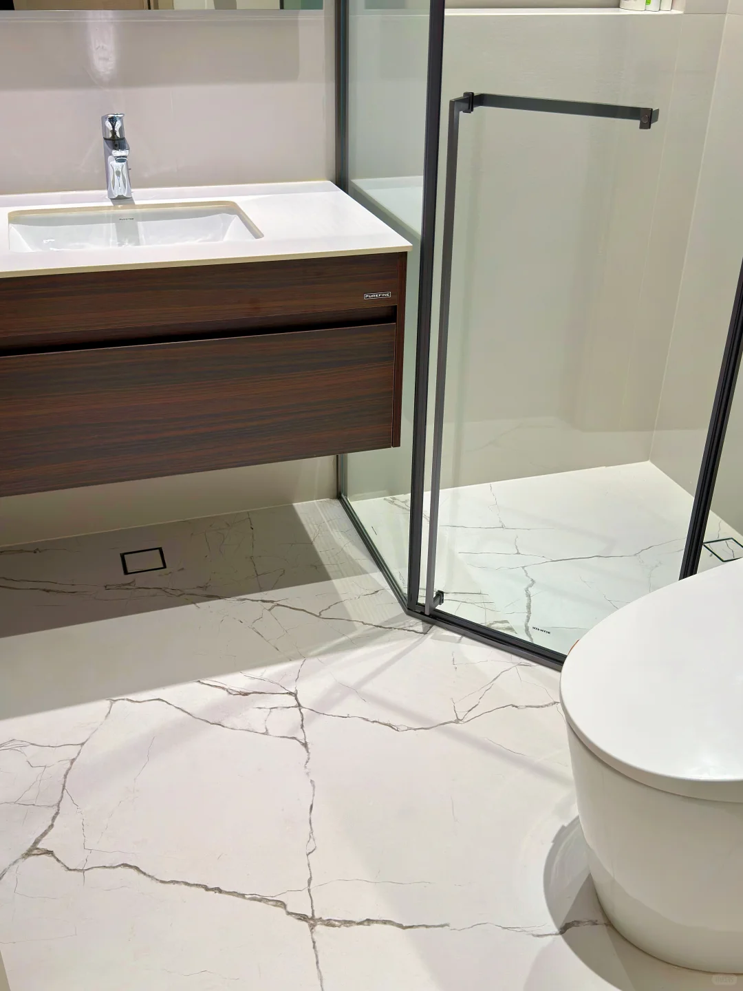 墙面是东鹏宝格丽白,洁白的底色搭配灰黑色有流动感的纹理,[自拍R]像一幅淡雅的水墨画,细节感满满,作为背景墙点缀,精致又高级。地面也是东鹏家的锡耶纳通铺,和我家岛台岩板纹路很像,还带点金色的纹理,低调中带着奢华感。