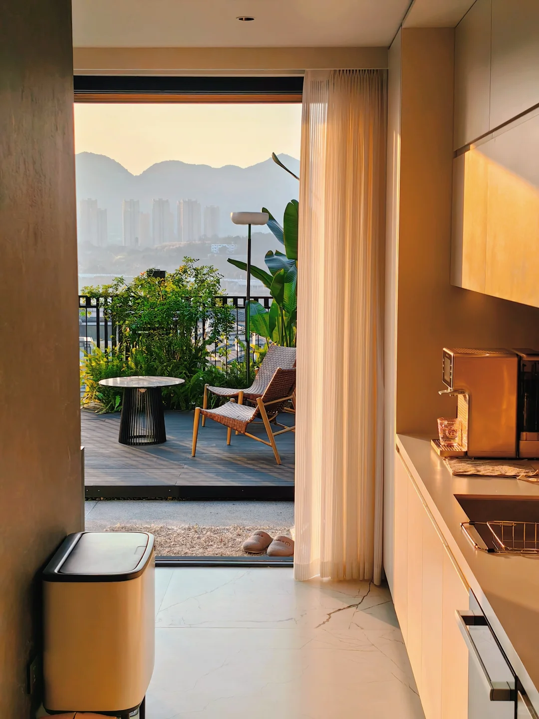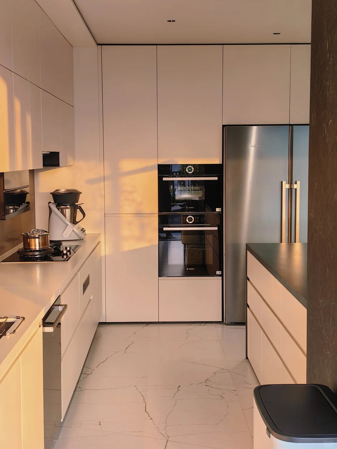 西厨岛台光线充足,但有根承重柱,我用深色岩板(P[三R])包裹,和地面形成反差,奢石纹理提升了西厨空间的艺术性,也极大降低承重柱带来的不适感~