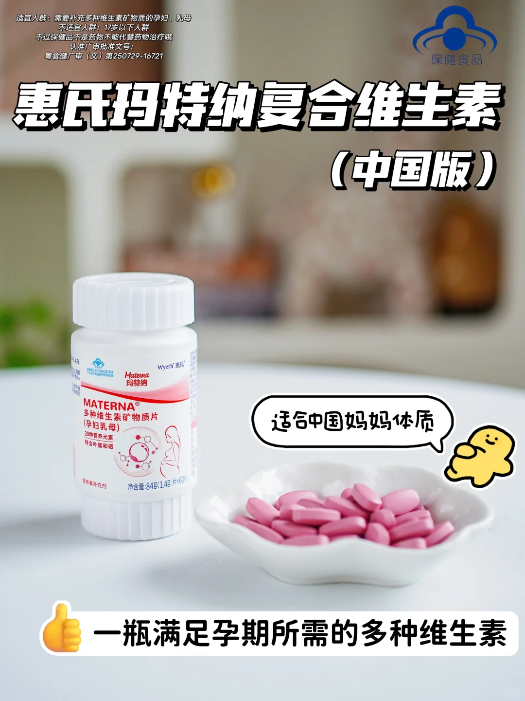 在我怀樱桃的时候,备孕期间就做了很多功课,综合我个人的身体体质,以及身边的宝妈朋友都在给我推荐惠氏玛特纳多维(中国版),我仔细去了解了一下,这款是专门根据中国人的膳食饮食设计的配方,含量都很适中,科学配比20种中国妈妈易缺乏微量营养素,就这么小小一粒里面多种维生素,硒、镁,钙铁锌等微量元素通通都有,不含碘钠。非常贴合中国孕哺期妈妈对营养的需求~孕期直接解决了那么多瓶瓶罐罐的烦恼,片剂小,不用担心不好吞咽,我基本上是早餐后吃,就着水咕噜一下就顺下去了~!