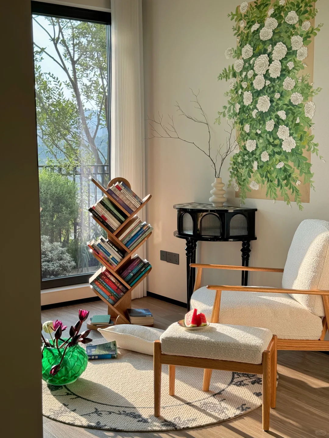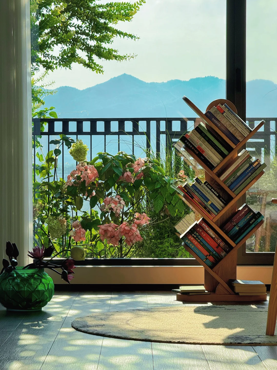 当然还得要有书📖,树丫造型的实木书架📚充满趣味,🙅‍♀️我不想把它靠墙放,就这样斜斜的一摆,摞上近期常看的书📕,像极了枝繁叶茂的大树🌳,一本本书就是那一片片🍃树叶~