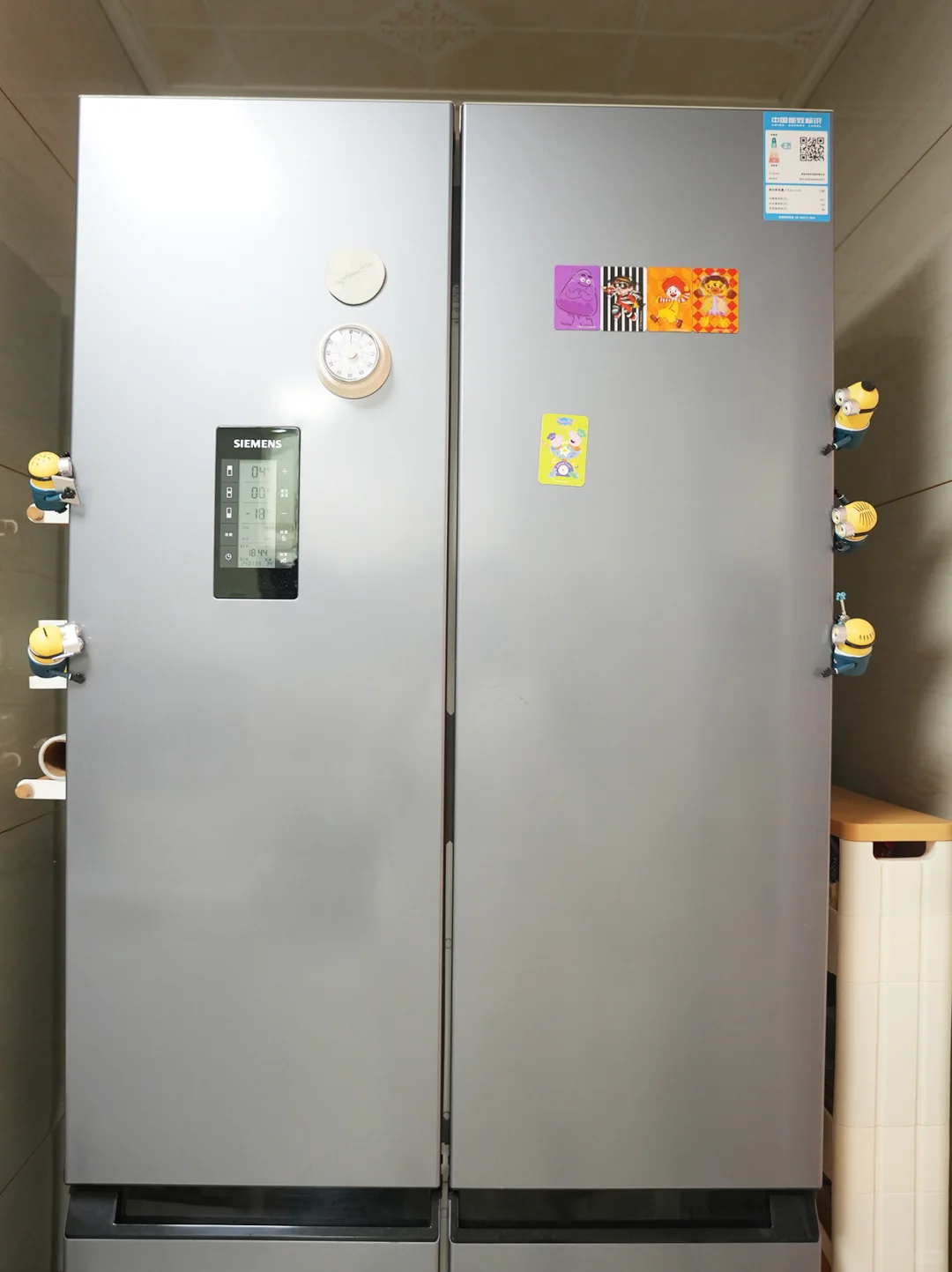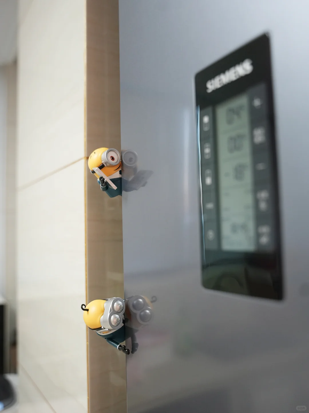 厨房里,冰箱门上,小黄人特工正“执行冷链监控任务”,它们或是在仔细检查食品新鲜度,或是在记录冷藏温度,确保食材安全[吧唧R]